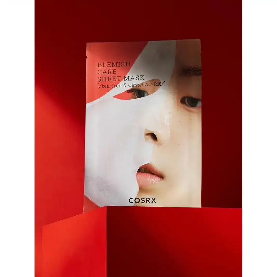 Buy COSRX AC Collection Blemish Care Sheet Mask for soothing acne-prone skin. Infused with 9,000ppm Tea Tree Extract to calm redness, Niacinamide to fade dark spots, and Ectoin for lasting hydration, this 3-layer cellulose mask provides targeted care, hydration, and radiance for clearer, healthier-looking skin.