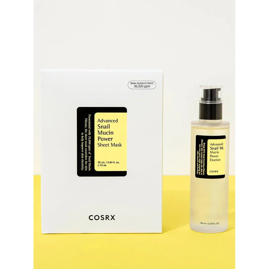 Buy COSRX Advanced Snail 96 Mucin Power Essence Sheet Mask for intense hydration, repair, and radiance. Powered by 35,000 ppm snail mucin, it soothes irritation, reduces scars, and enhances elasticity. Perfect for achieving soft, glowing skin, it’s suitable for all skin types.
