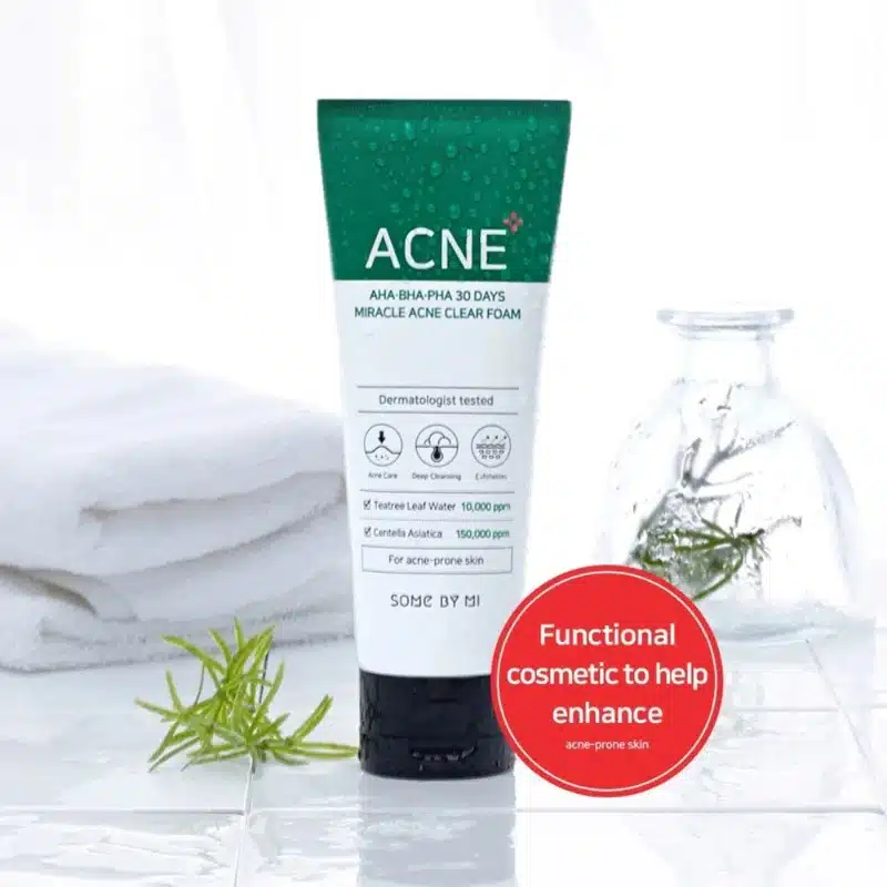 Buy Some By Mi AHA BHA PHA 30 Days Miracle Acne Clear Foam to cleanse, control oil, and fight acne. With AHA, BHA, and PHA exfoliating acids plus Truecica™ for calming, this foam targets pores, excess sebum, and impurities. Perfect for acne-prone and sensitive skin. Achieve clearer, balanced skin in 30 days.