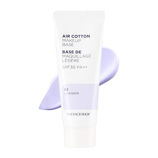 Buy The Face Shop Air Cotton Makeup Base SPF30 PA++ #02 Lavender for a luminous, even complexion. This lightweight primer neutralizes yellow undertones, enhances radiance with niacinamide and chamomile, and provides SPF30 sun protection. Perfect for all skin types, especially sensitive skin. Buy now and add to cart for glowing, flawless skin!