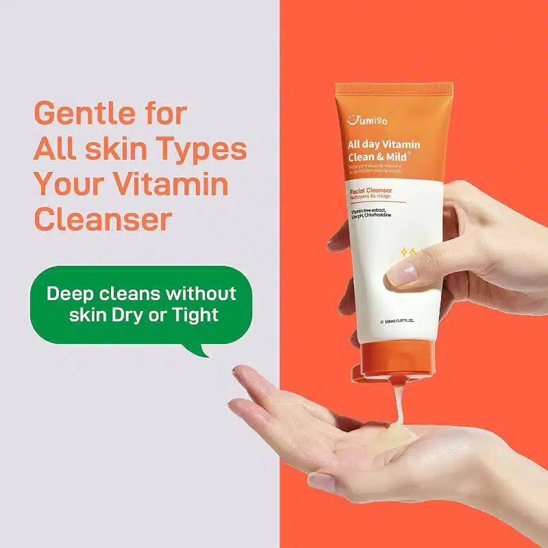 Buy Jumiso All Day Vitamin Clean & Mild Facial Cleanser for a deep, gentle cleanse. With Salicylic Acid to reduce oil and unclog pores, Vitamin C to brighten, and Tea Tree & Centella to soothe, this low-pH cleanser keeps skin balanced and radiant. Ideal for all skin types, it leaves a clean, refreshed feel without dryness.