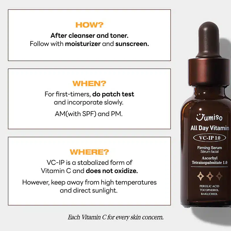 Buy Jumiso All Day Vitamin VC-IP 1.0 Firming Serum to firm, brighten, and rejuvenate your skin. Formulated with Bakuchiol and Vitamin C, this serum boosts collagen, evens skin tone, and fades dark spots. Suitable for all skin types, it’s lightweight and fast-absorbing for a radiant, youthful glow.