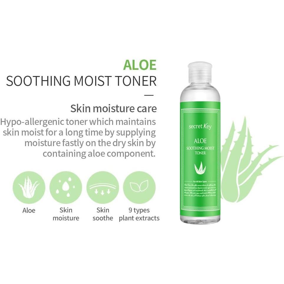Buy Secret Key Aloe Soothing Moist Toner for deep hydration and soothing care. Infused with Aloe Vera and 11 botanical extracts, it calms irritation, hydrates without stickiness, and balances your skin’s pH. Perfect for daily use, especially on sensitive or dry skin, this alcohol-free toner refreshes and revitalizes for a healthy complexion.