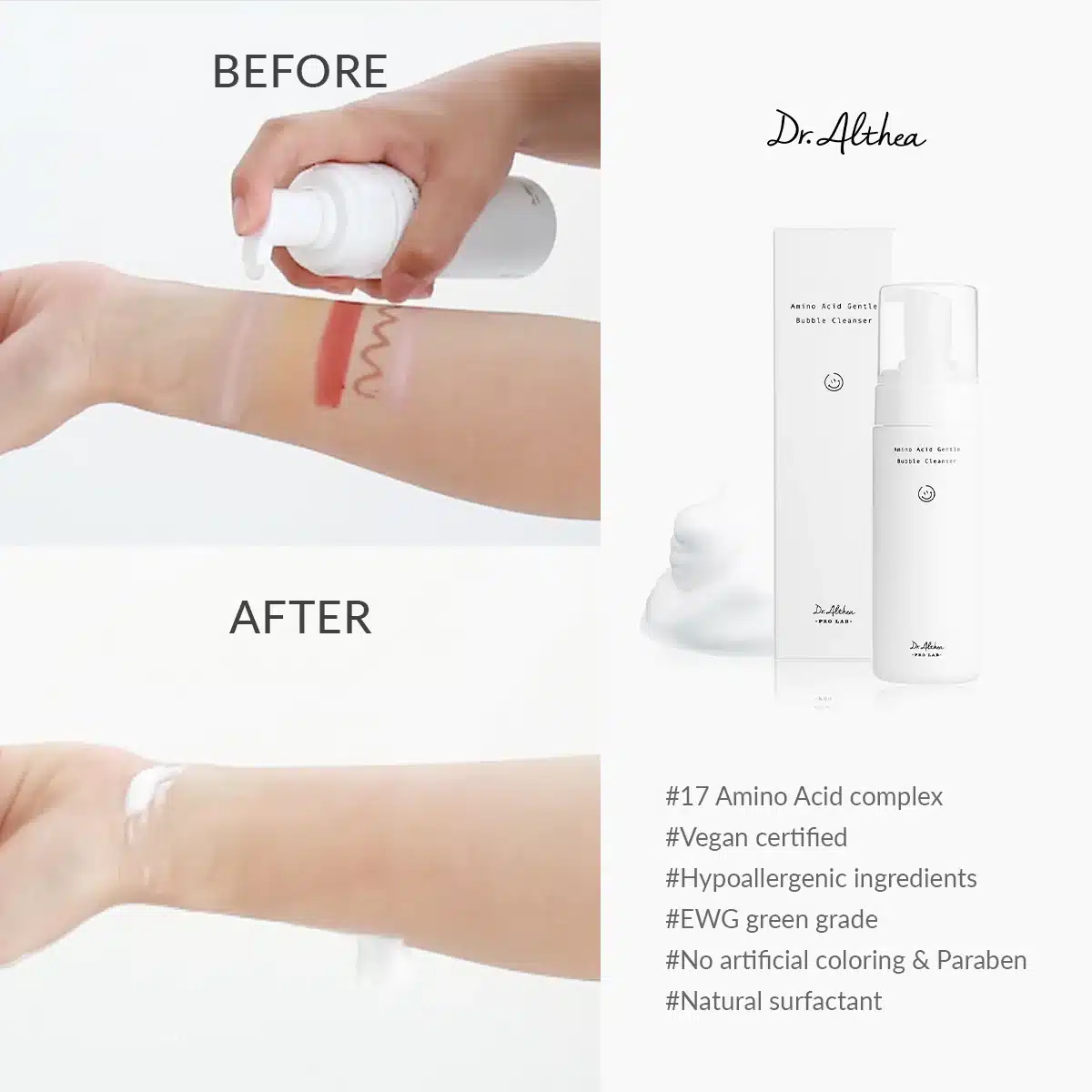Buy Dr. Althea Amino Acid Gentle Bubble Cleanser for deeply clean, hydrated skin. This gentle formula, with 17 amino acids and nano-sized foam, clears impurities while preserving moisture, leaving skin soft and balanced. Perfect for sensitive and acne-prone skin, this low-pH cleanser fortifies and soothes without drying.
