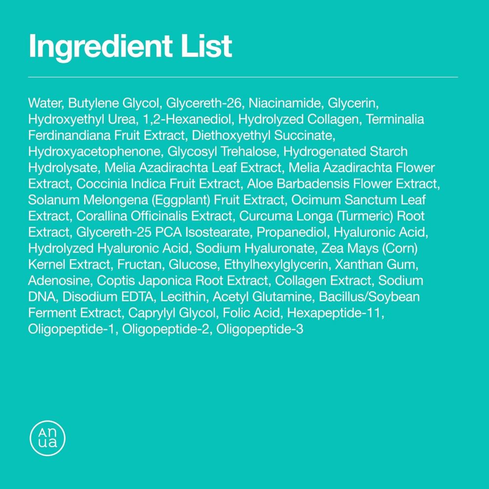 Water, Butylene Glycol, Glycereth-26, Niacinamide, Glycerin, 1,2-Hexanediol, Diethoxyethyl Succinate, Hydroxyethyl Urea, Hydroxyacetophenone, Glycereth-25 PCA Isostearate, Glycosyl Trehalose, Hydrogenated Starch Hydrolysate, Melia Azadirachta Leaf Extract, Ethylhexylglycerin, Xanthan Gum, Propanediol, Adenosine, Melia Azadirachta Flower Extract, Coccinia Indica Fruit Extract, Disodium EDTA, Sodium DNA (100ppm), Hydrolyzed Collagen, Aloe Barbadensis Flower Extract, Solanum Melongena (Eggplant) Fruit Extract, Coptis Japonica Root Extract, Ocimum Sanctum Leaf Extract, Zea Mays (Corn) Kernel Extract, Corallina Officinalis Extract, Curcuma Longa (Turmeric) Root Extract, Sodium Hyaluronate (5.002ppm), Hyaluronic Acid (5ppm), Hydrolyzed Hyaluronic Acid (5ppm), Terminalia Ferdinandiana Fruit Extract, Fructan, Glucose, Lecithin, Acetyl Glutamine, Collagen Extract, Bacillus/Soybean Ferment Extract, Caprylyl Glycol, Folic Acid, Hexapeptide-11, Oligopeptide-1, Oligopeptide-2, Oligopeptide-3