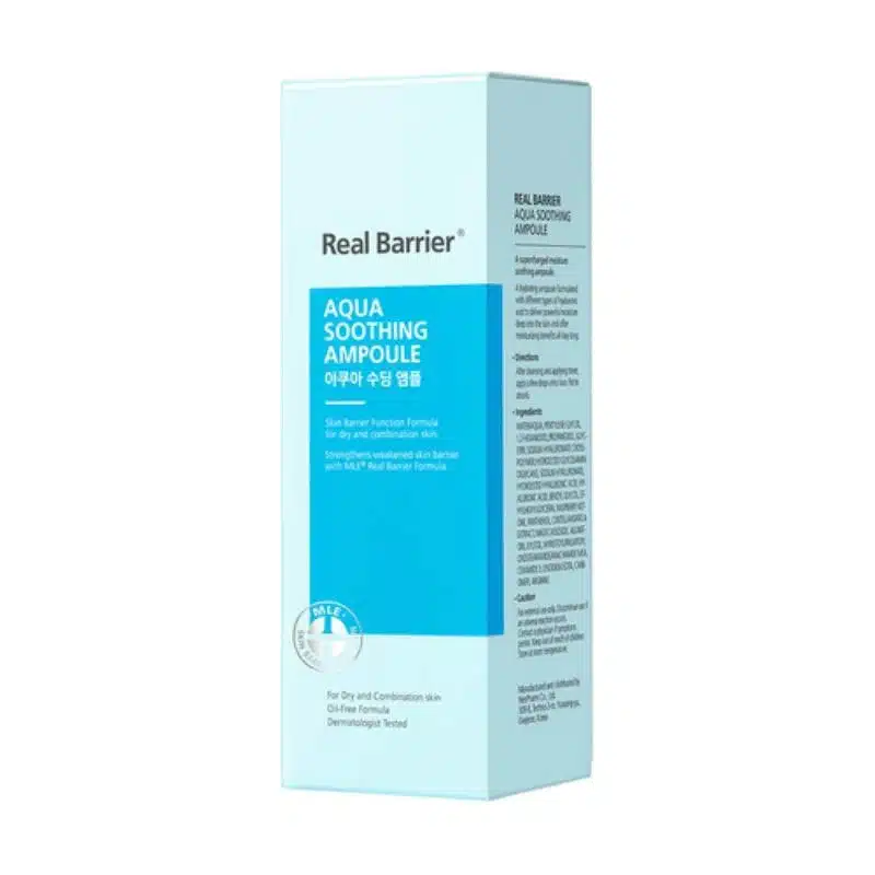 Buy Real Barrier Aqua Soothing Ampoule for deep, non-greasy hydration that cools and calms skin. Formulated with 5 types of Hyaluronic Acid and Dual Ceramides, it locks in moisture while soothing with Madecassoside and Blue Tansy Oil. Ideal for oily yet dehydrated skin, it absorbs quickly, leaving your skin refreshed and balanced.