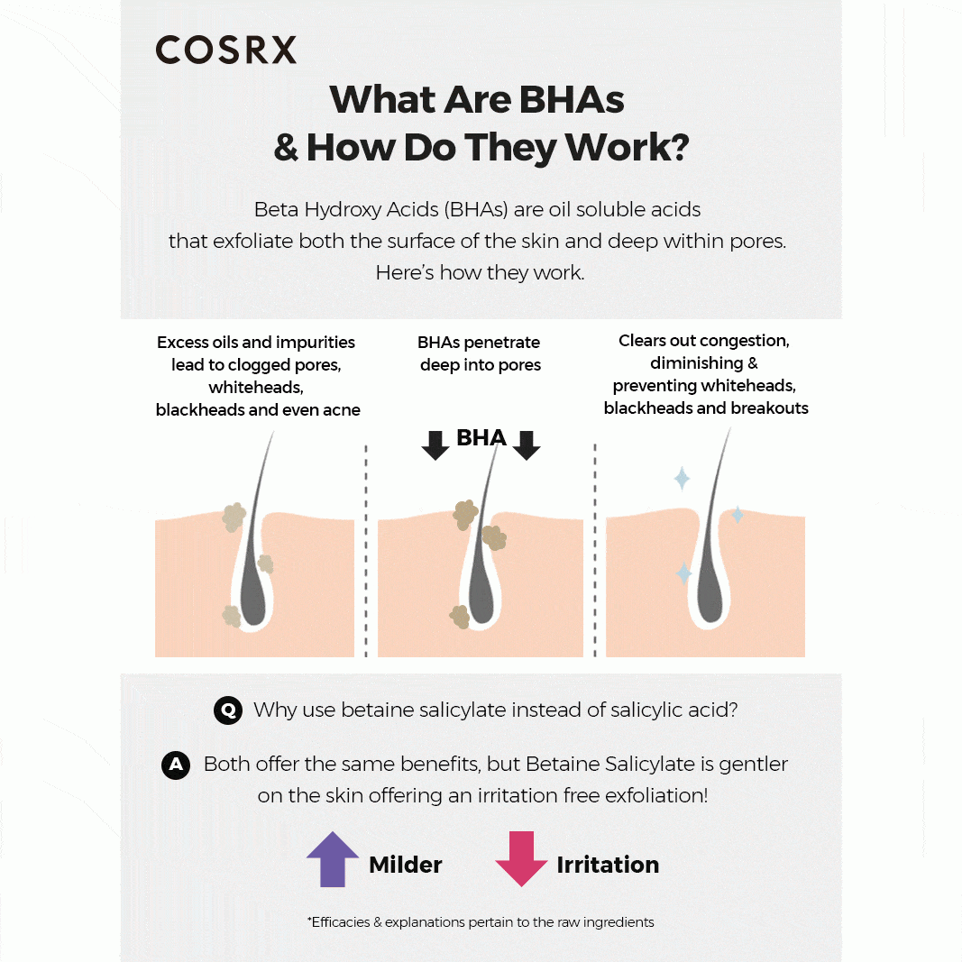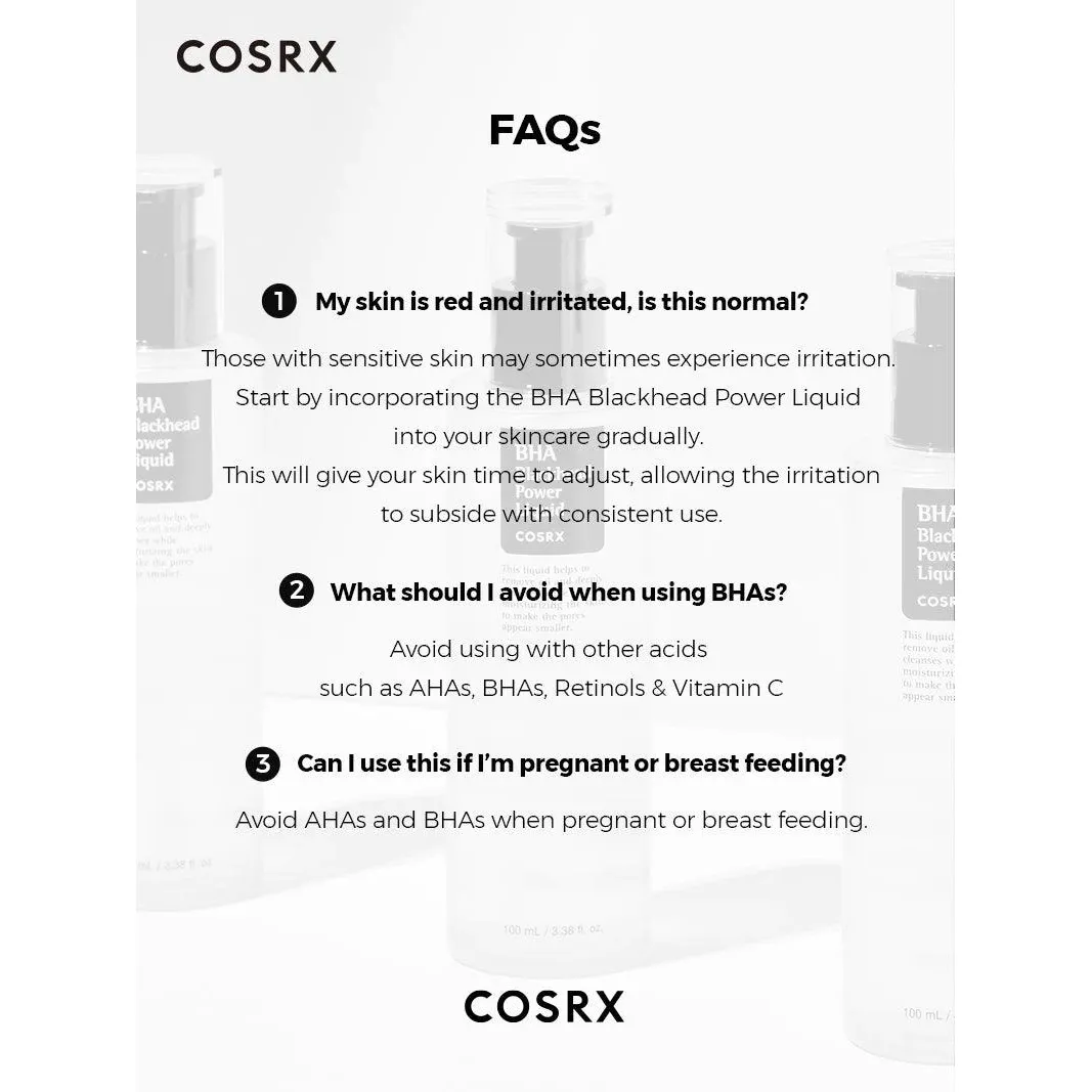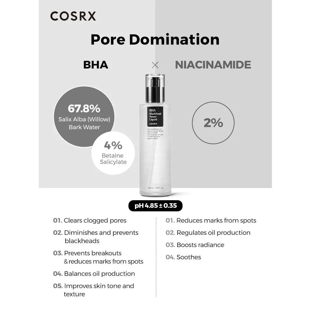 Buy COSRX BHA Blackhead Power Liquid to clear and refine your skin. This potent formula with 4% Betaine Salicylate and Niacinamide unclogs pores, reduces blackheads, and balances oil, leaving skin smoother and brighter. Suitable for oily and acne-prone skin, it minimizes breakouts and evens skin tone for a radiant look.