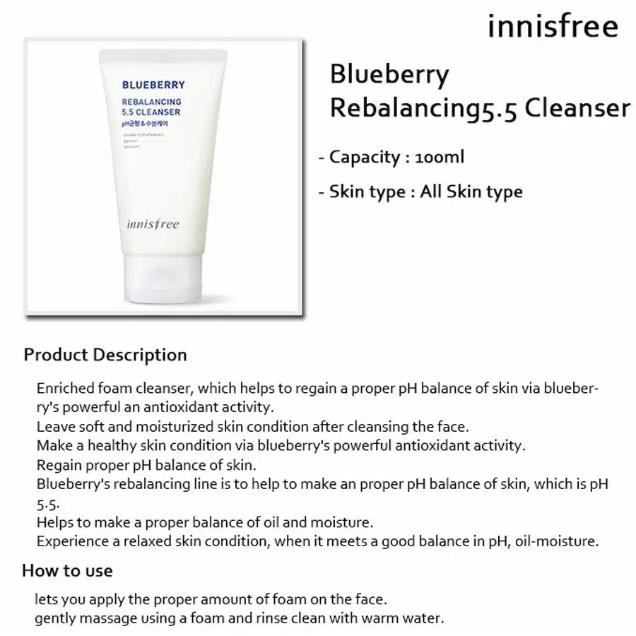 Buy Innisfree Blueberry Rebalancing 5.5 Cleanser to refresh and balance your skin. This gentle, antioxidant-rich formula with blueberries cleanses without stripping moisture, maintaining skin’s pH for a smooth, hydrated finish. Perfect for daily use, it leaves skin soft, radiant, and prepped for the day ahead.