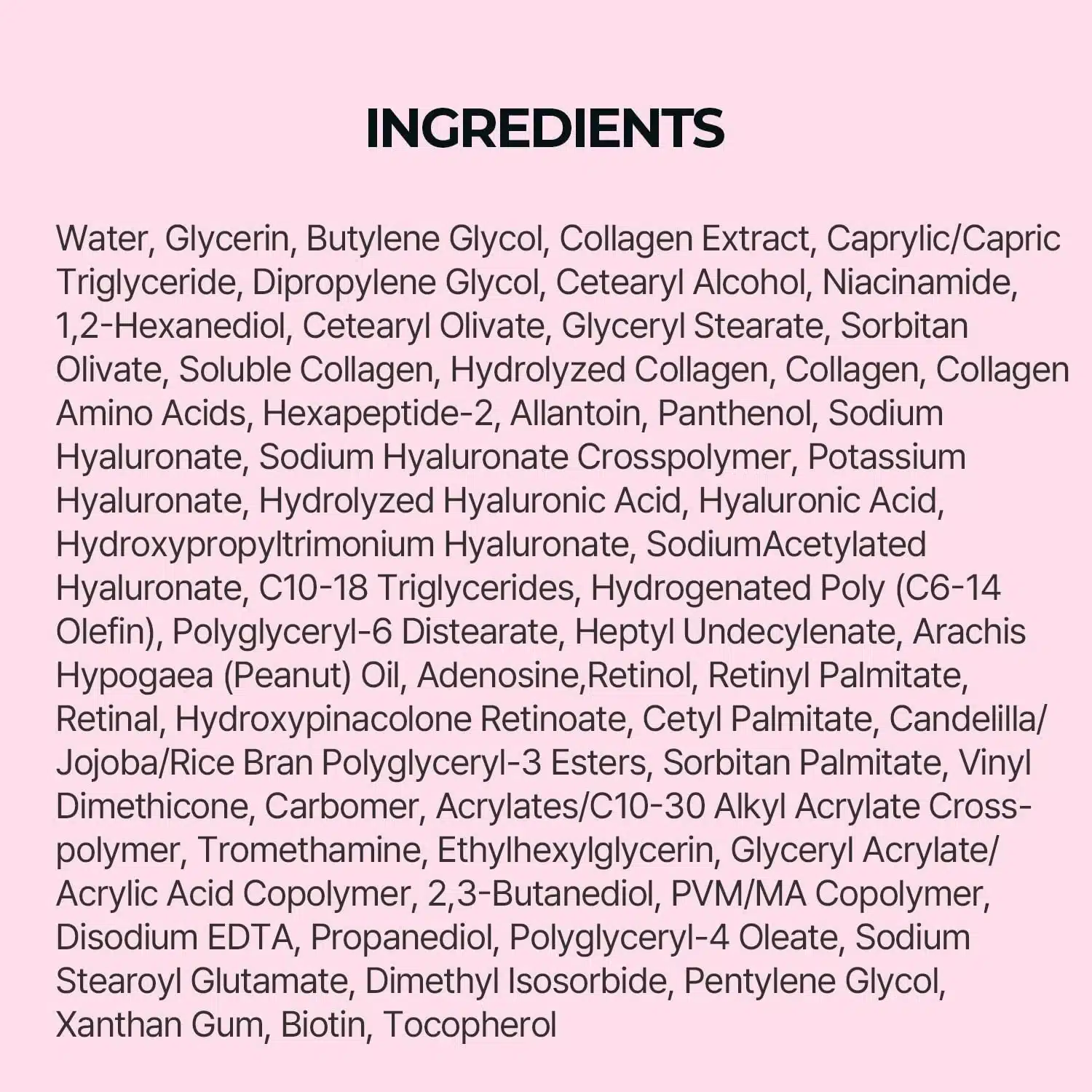 Water, Glycerin, Butylene Glycol, 1,2-Hexanediol, Soluble Collagen, Collagen, Collagen Extract, Collagen Amino Acids, Hydrolyzed Collagen, Dipropylene Glycol, Caprylic/Capric Triglyceride, Cetearyl Olivate, Sorbitan Olivate, Panthenol, Glyceryl Acrylate/Acrylic Acid Copolymer, PVM/MA Copolymer, Xanthan Gum, Cetearyl Alcohol, Niacinamide, Glyceryl Stearate, Polyglyceryl-6 Distearate, Candelilla/Jojoba/Rice Bran Polyglyceryl-3 Esters, Hexapeptide-2, Biotin, C10-18 Triglycerides, Cetyl Palmitate, Sorbitan Palmitate, Hydrogenated Poly(C6-14 Olefin), Tocopherol, Heptyl Undecylenate, Vinyl Dimethicone, Carbomer, Acrylates/C10-30 Alkyl Acrylate Crosspolymer, Tromethamine, 2,3-Butanediol, Propanediol, Polyglyceryl-4 Oleate, Sodium Stearoyl Glutamate, Dimethyl Isosorbide, Arachis Hypogaea (Peanut) Oil, Hydroxypinacolone Retinoate, Retinol, Retinyl Palmitate, Retinal, Ethylhexylglycerin, Adenosine, Disodium EDTA, Sodium Hyaluronate, Sodium Hyaluronate Crosspolymer, Potassium Hyaluronate, Hydroxypropyltrimonium Hyaluronate, Hydrolyzed Hyaluronic Acid, Hyaluronic Acid, Pentylene Glycol, Sodium Acetylated Hyaluronate, Allantoin