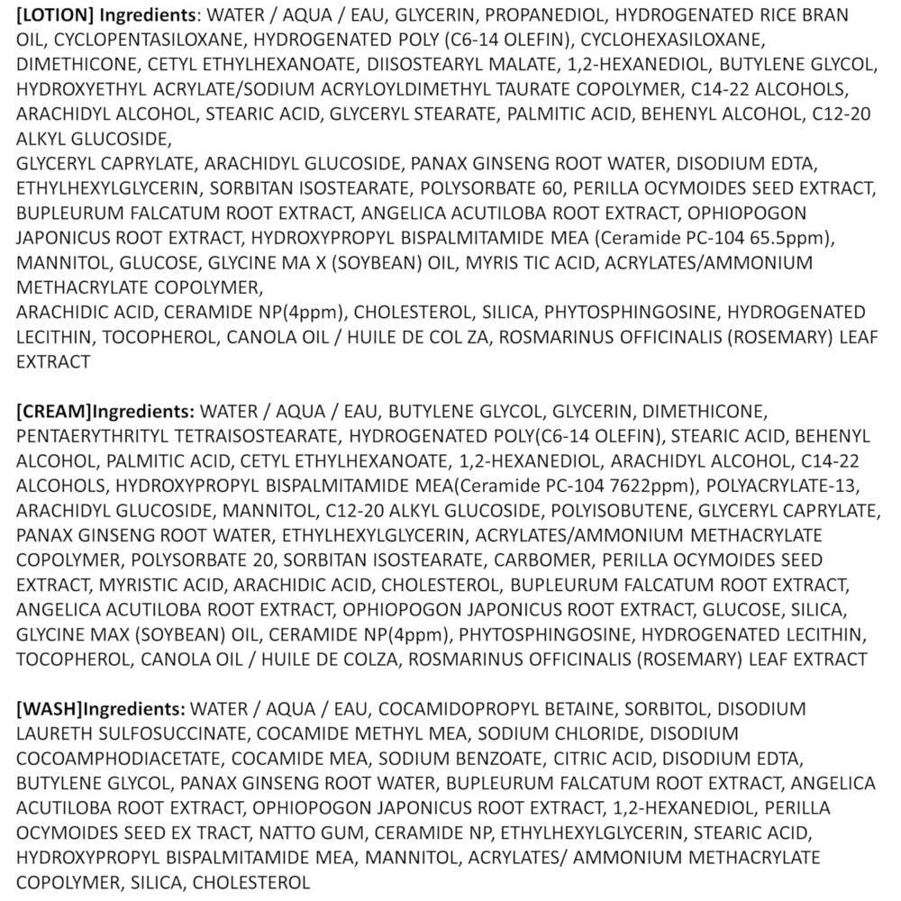 [Ceramide Ato Lotion] Water, Glycerin, Propanediol, Hydrogenated Rice Bran Oil, Cyclopentasiloxane, Hydrogenated Poly(C6-14 Olefin), Cyclohexasiloxane, Dimethicone, Cetyl Ethylhexanoate, Diisostearyl Malate, 1,2-Hexanediol, Butylene Glycol, Hydroxyethyl Acrylate/Sodium Acryloyldimethyl Taurate Copolymer, C14-22 Alcohols, Arachidyl Alcohol, Stearic Acid, Glyceryl Stearate, Palmitic Acid, Behenyl Alcohol, C12-20 Alkyl Glucoside, Glyceryl Caprylate, Arachidyl Glucoside, Panax Ginseng Root Water, Disodium EDTA, Ethylhexylglycerin, Sorbitan Isostearate, Polysorbate 60, Perilla Ocymoides Seed Extract, Bupleurum Falcatum Root Extract, Angelica Acutiloba Root Extract, Ophiopogon Japonicus Root Extract, Hydroxypropyl Bispalmitamide MEA(Ceramide PC-104 65.5ppm), Mannitol, Glucose, Glycine Max (Soybean) Oil, Myristic Acid, Acrylates/Ammonium Methacrylate Copolymer, Arachidic Acid, Ceramide NP(4ppm), Cholesterol, Silica, Phytosphingosine, Hydrogenated Lecithin, Tocopherol, Canola Oil, Rosmarinus Officinalis (Rosemary) Leaf Extract [Ceramide Ato Concentrate Cream] Water, Butylene Glycol, Glycerin, Dimethicone, Pentaerythrityl Tetraisostearate, Hydrogenated Poly(C6-14 Olefin), Stearic Acid, Behenyl Alcohol, Palmitic Acid, Cetyl Ethylhexanoate, 1,2-Hexanediol, Arachidyl Alcohol, C14-22 Alcohols, Hydroxypropyl Bispalmitamide MEA(Ceramide PC-104 7622ppm), Polyacrylate-13, Arachidyl Glucoside, Mannitol, C12-20 Alkyl Glucoside, Polyisobutene, Glyceryl Caprylate, Panax Ginseng Root Water, Ethylhexylglycerin, Acrylates/Ammonium Methacrylate Copolymer, Polysorbate 20, Sorbitan Isostearate, Carbomer, Perilla Ocymoides Seed Extract, Myristic Acid, Arachidic Acid, Cholesterol, Bupleurum Falcatum Root Extract, Angelica Acutiloba Root Extract, Ophiopogon Japonicus Root Extract, Glucose, Silica, Glycine Max (Soybean) Oil, Ceramide NP(4ppm), Phytosphingosine, Hydrogenated Lecithin, Tocopherol, Canola Oil, Rosmarinus Officinalis (Rosemary) Leaf Extract [Ceramide Ato 6.0 Top to Toe Wash]Water, Cocamidopropyl Betaine, Sorbitol, Disodium Laureth Sulfosuccinate, Cocamide Methyl MEA, Sodium Chloride, Disodium Cocoamphodiacetate, Cocamide MEA, 1,2-Hexanediol, Sodium Benzoate(0.5%), Citric Acid, Disodium EDTA, Butylene Glycol, Panax Ginseng Root Water, Bupleurum Falcatum Root Extract, Angelica Acutiloba Root Extract, Ophiopogon Japonicus Root Extract, Perilla Ocymoides Seed Extract, Natto Gum, Ceramide NP(10ppb), Ethylhexylglycerin, Stearic Acid, Hydroxypropyl Bispalmitamide MEA(Ceramide PC-104 3ppb), Mannitol, Acrylates/Ammonium Methacrylate Copolymer, Silica, Cholesterol
