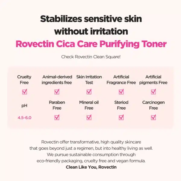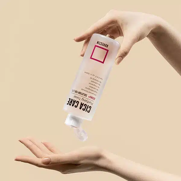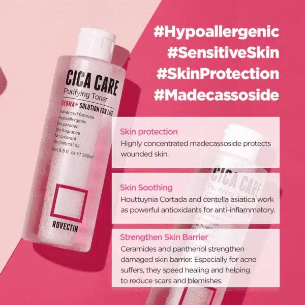 Buy Rovectin Cica Care Purifying Toner for a refreshing, calming, and hydrating experience. With Centella Asiatica and Madecassoside, this toner soothes sensitive skin, reduces scars, and reinforces the skin’s barrier. Ideal for sensitive skin, it leaves a balanced, clear, and smooth complexion without irritation.