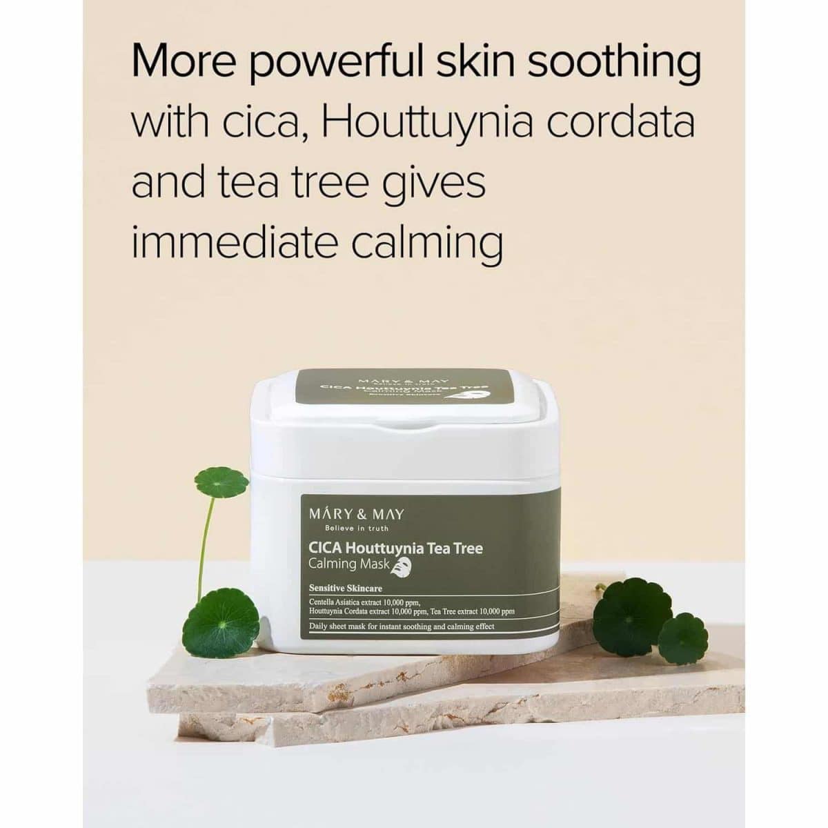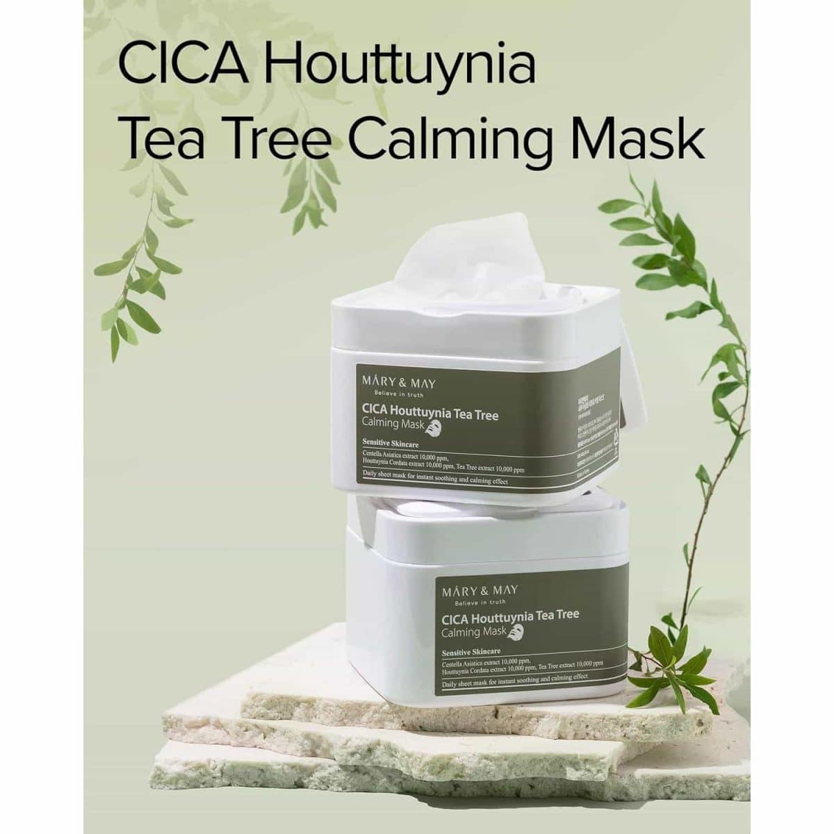 Buy Mary & May Cica Houttuynia Tea Tree Calming Mask for calm skin! This vegan sheet mask with Centella Asiatica, Houttuynia Cordata, and Tea Tree Extract soothes sensitive skin, reduces acne, and hydrates. With 30 eco-friendly sheets, it’s perfect for daily skincare. Add to cart for radiant skin.