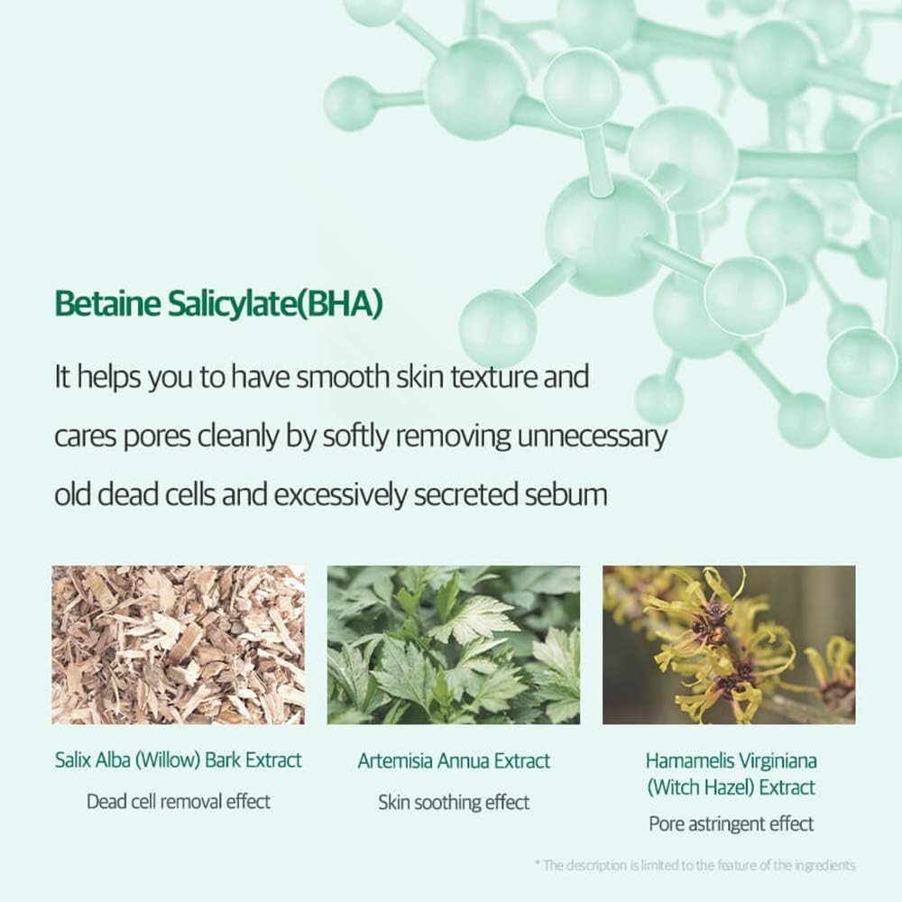 Water, Glycerin, Butylene Glycol, Salicylic Acid, Centella Asiatica Extract, Sodium Hyaluronate, Asiaticoside, Madecassoside, Madecassic Acid, Asiatic Acid, Propolis Extract, Artemisia Annua Extract, Hamamelis Virginiana (Whitch Hazel) Leaf Extract, Salix Alba (Willow) Bark Extract, Allantoin, Beta-Glucan, Tromethamine, Diethoxyethyl Succinate, Chlorphenesin, Polyglyceryl-10 Laurate, Polyglyceryl-10 Myristate, Ethylhexylglycerin, Dextrin, Gardenia Florida Fruit Extract, Disodium EDTA, Tocopherol, Propanediol, Betaine, Dipotassium Glycyrrhizate, Fragracen, 1,2-Hexanediol