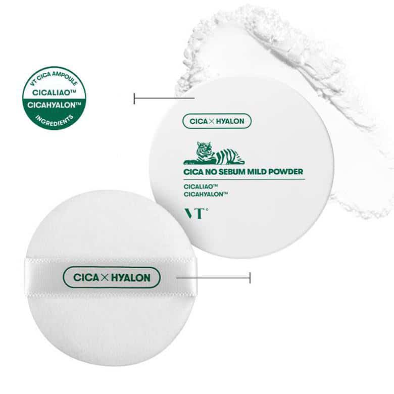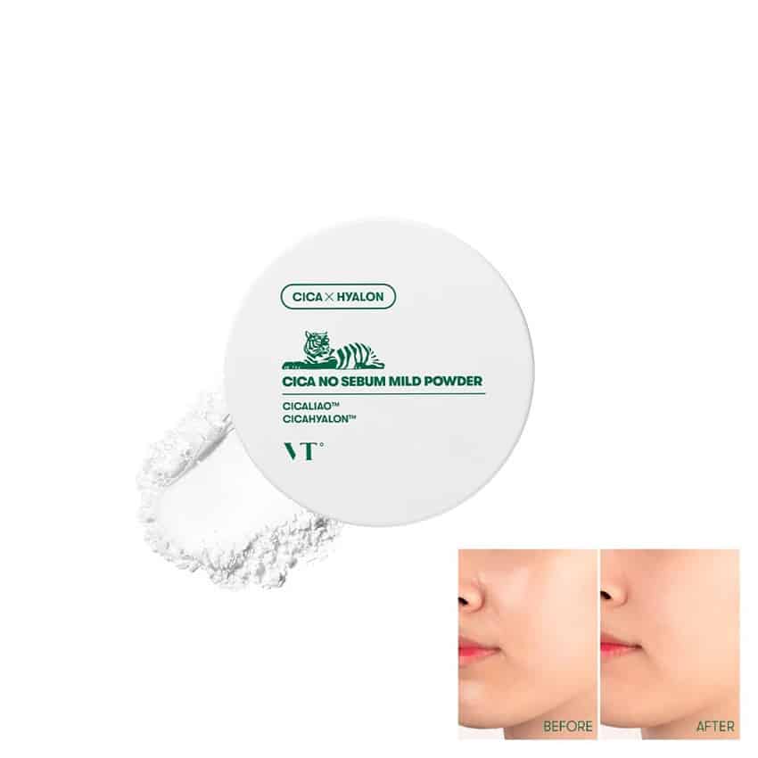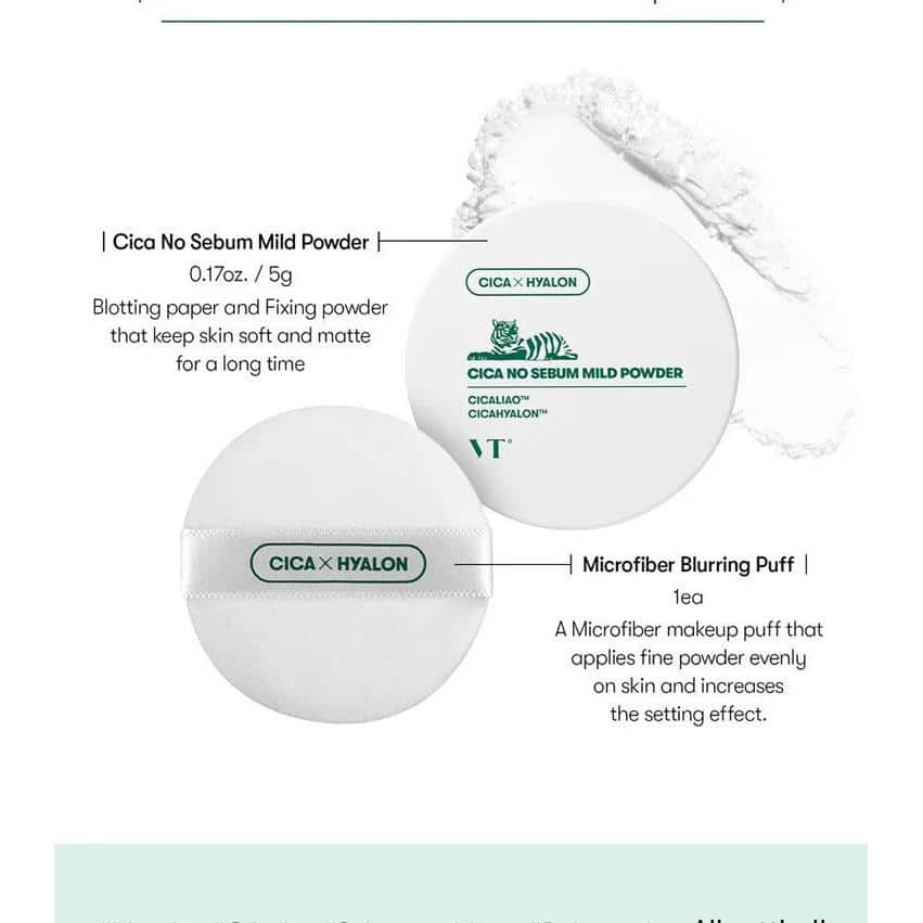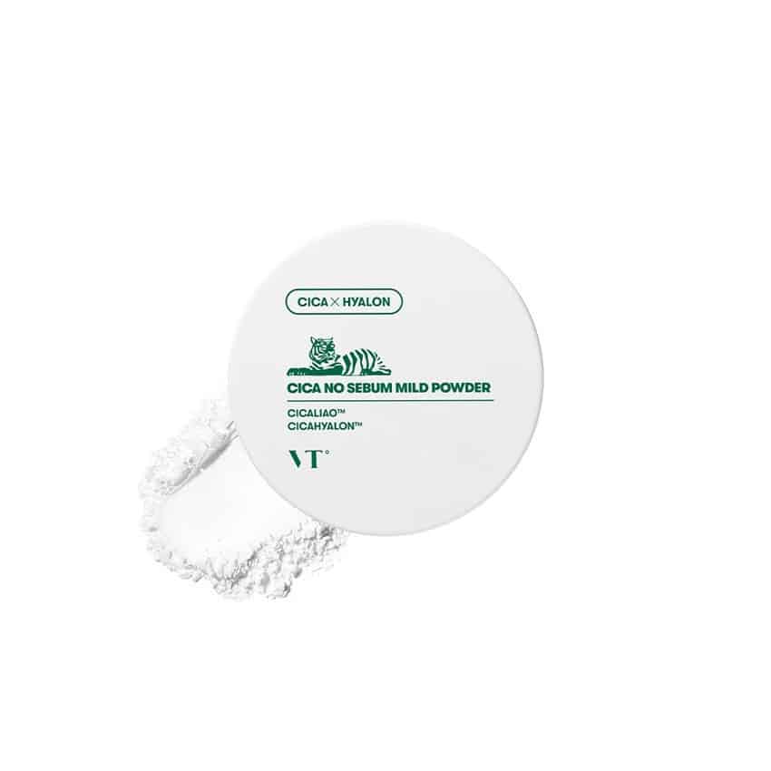 Buy VT Cosmetics Cica No Sebum Mild Powder—a lightweight, vegan powder for oily and sensitive skin. Infused with Centella Asiatica and Hyaluronic Acid, it banishes shine, hydrates, and sets makeup flawlessly. Get a fresh, matte look that lasts all day. Add to cart now!