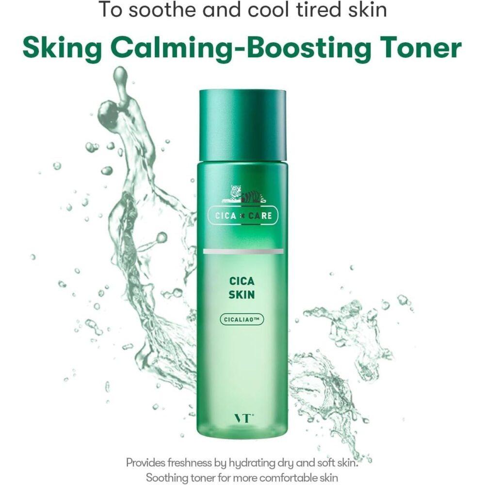 Buy VT Cosmetics Cica Skin Toner to calm, hydrate, and fortify sensitive skin. This toner combines Centella Asiatica extract and Green Propolis extract to reduce redness, restore moisture, and protect the skin barrier. Its lightweight formula absorbs quickly, making it ideal for daily use and layering in your skincare routine.