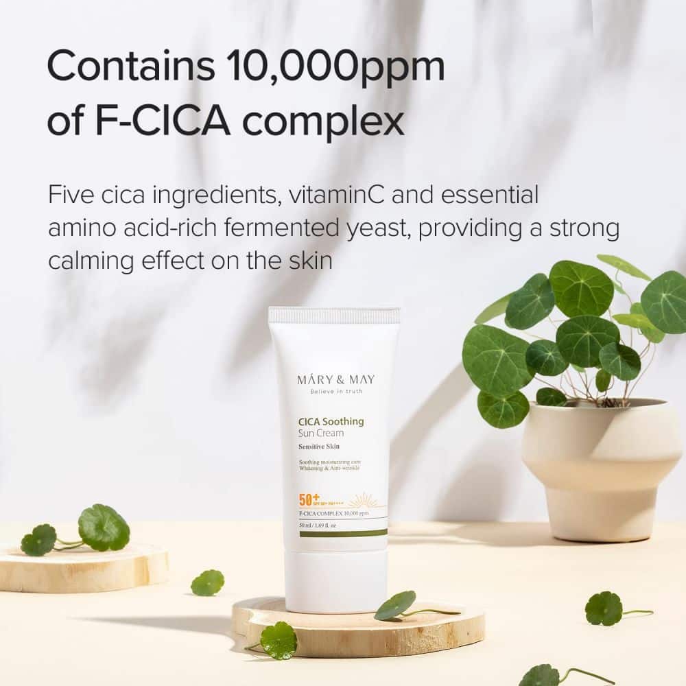 Buy Mary & May Cica Soothing Sun Cream SPF50+ PA++++ for radiant suncare! This vegan sunscreen with F-CICA Complex and niacinamide soothes sensitive skin, hydrates, and brightens without a white cast. Perfect for all skin types, it’s reef-friendly. Add to cart for protected skin.