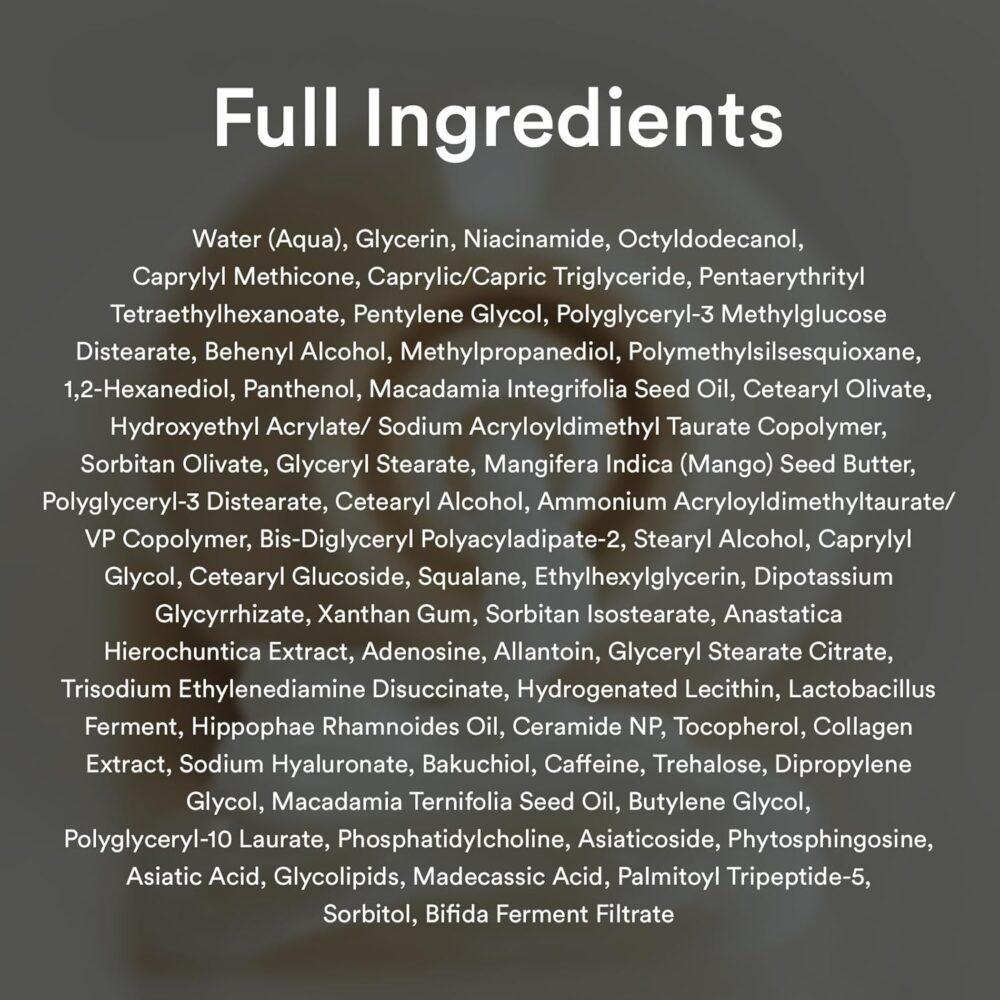 Water, Glycerin, Niacinamide, Octyldodecanol, Caprylyl Methicone, Caprylic/Capric Triglyceride, Pentaerythrityl Tetraethylhexanoate, Pentylene Glycol, Polyglyceryl-3 Methylglucose Distearate, Behenyl Alcohol, Methylpropanediol, Polymethylsilsesquioxane, 1,2-Hexanediol, Panthenol, Macadamia Integrifolia Seed Oil, Cetearyl Olivate, Hydroxyethyl Acrylate/Sodium Acryloyldimethyl Taurate Copolymer, Sorbitan Olivate, Glyceryl Stearate, Mangifera Indica (Mango) Seed Butter, Polyglyceryl-3 Distearate, Cetearyl Alcohol, Ammonium Acryloyldimethyltaurate/VP Copolymer, Bis-Diglyceryl Polyacyladipate-2, Stearyl Alcohol, Caprylyl Glycol, Cetearyl Glucoside, Squalane, Ethylhexylglycerin, Dipotassium Glycyrrhizate, Xanthan Gum, Sorbitan Isostearate, Anastatica Hierochuntica Extract, Adenosine, Allantoin, Glyceryl Stearate Citrate, Trisodium Ethylenediamine Disuccinate, Hydrogenated Lecithin, Lactobacillus Ferment, Hippophae Rhamnoides Oil, Ceramide NP, Tocopherol, Collagen Extract, Sodium Hyaluronate, Bakuchiol, Caffeine, Trehalose, Dipropylene Glycol, Macadamia Ternifolia Seed Oil, Butylene Glycol, Polyglyceryl-10 Laurate, Phosphatidylcholine, Asiaticoside, Phytosphingosine, Asiatic Acid, Glycolipids, Madecassic Acid, Palmitoyl Tripeptide-5, Sorbitol, Bifida Ferment Filtrate