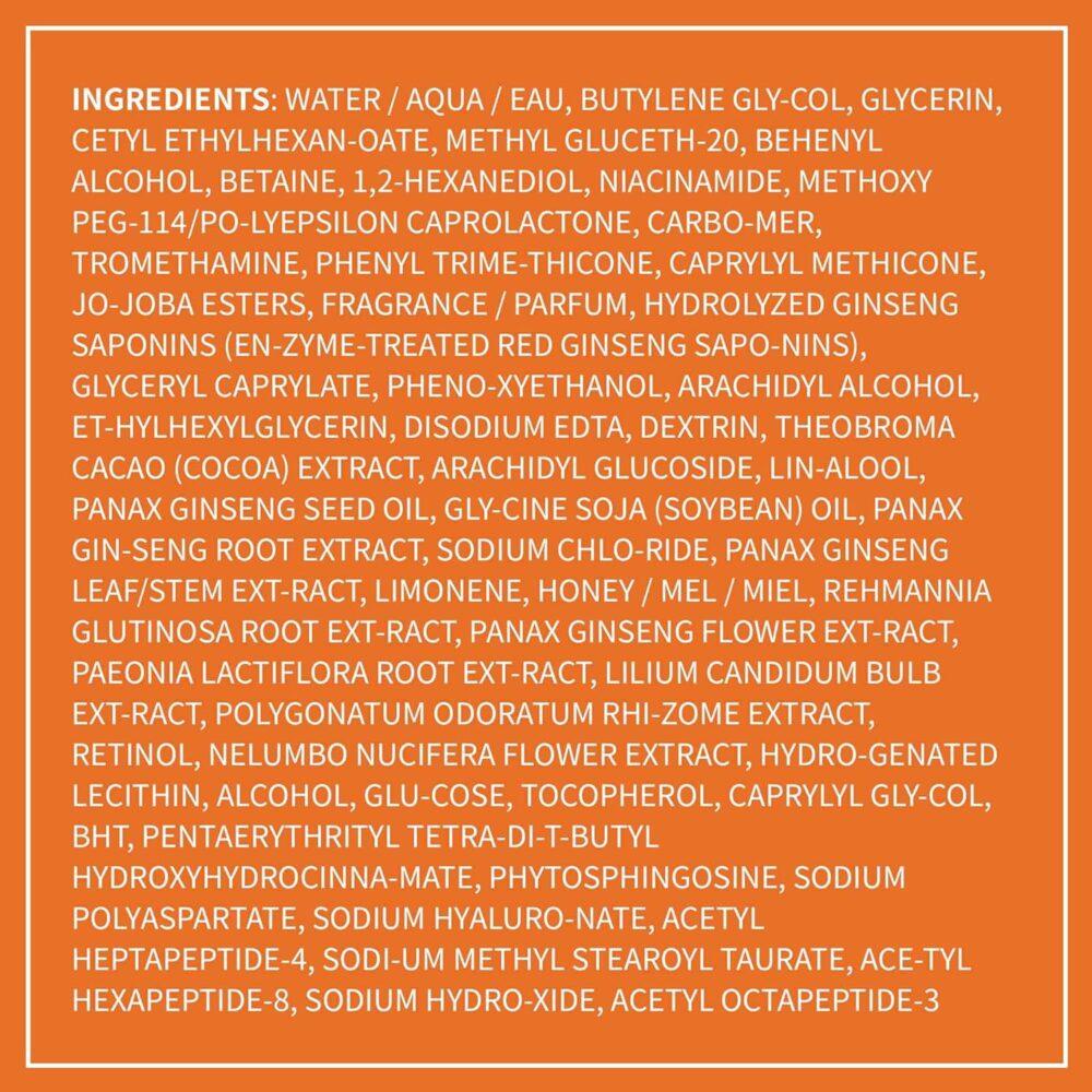 Distilled Water, Butylene Glycol, Glycerin, Cetyl Ethylhexanoate, Methyl Gluceth-20, Behenyl Alcohol, Betaine, 1,2-Hexanediol, Niacinamide, Methoxy PEG-114/Polyepsilon Caprolactone, Carbomer, Tromethamine, Phenyl Trimethicone, Caprylyl Methicone, Jojoba Esters, Fragrance, Hydrolyzed Ginseng Saponins, Glyceryl Caprylate, Phenoxyethanol, Arachidyl Alcohol, Ethylhexylglycerin, Disodium EDTA, Dextrin, Theobroma Cacao (Cocoa) Extract, Arachidyl Glucoside, Linalool, Panax Ginseng Seed Oil, Glycine Soja (Soybean) Oil, Panax Ginseng Root Extract, Sodium Chloride, Panax Ginseng Leaf/Stem Extract, Limonene, Honey, Rehmannia Chinensis Root Extract, Panax Ginseng Flower Extract, Paeonia Lactiflora Root Extract, Lilium Candidum Bulb Extract, Polygonatum Odoratum Rhizome Extract, Retinol, Nelumbo Nucifera Extract, Hydrogenated Lecithin, Alcohol, Glucose, Tocopherol, Caprylyl Glycol, BHT, Pentaerythrityl Tetra-di-t-butyl Hydroxyhydrocinnamate, Phytosphingosine, Sodium Polyaspartate, Sodium Hyaluronate, Acetyl Heptapeptide-4, Sodium Methyl Stearoyl Taurate, Acetyl Hexapeptide-8, Sodium Hydroxide, Acetyl Octapeptide-3