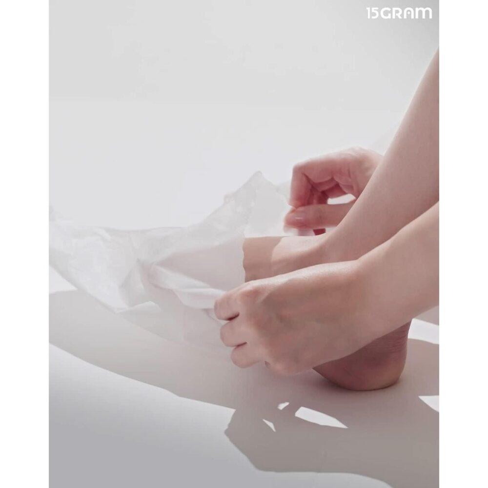 - Remove the foot mask and gently massage any remaining essence into the skin.