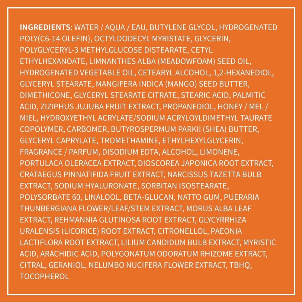 Purified Water, Butylene Glycol, Hydrogenated Poly(C6-14 Olefin), Octyldodecyl Myristate, Glycerin, Polyglyceryl-3 Methylglucose Distearate, Cetyl Ethylhexanoate, Limnanthes Alba (Meadowfoam) Seed Oil, Hydrogenated Vegetable Oil, Cetearyl Alcohol, 1,2-Hexanediol, Glyceryl Stearate, Mangifera Indica (Mango) Seed Butter, Dimethicone, Glyceryl Stearate Citrate, Stearic Acid, Palmitic Acid, Ziziphus Jujuba Fruit Extract, Propanediol, Honey, Hydroxyethyl Acrylate/Sodium Acryloyldimethyl Taurate Copolymer, Carbomer, Butyrospermum Parkii (Shea) Butter, Glyceryl Caprylate, Tromethamine, Ethylhexylglycerin, Fragrance, Disodium EDTA, Alcohol, Limonene, Portulaca Oleracea Extract, Dioscorea Japonica Root Extract, Crataegus Pinnatifida Fruit Extract, Narcissus Tazetta Bulb Extract, Sodium Hyaluronate, Sorbitan Isostearate, Polysorbate 60, Linalool, Beta-Glucan, Natto Gum, Pueraria Thunbergiana Flower/Leaf/Stem Extract, Morus Alba Leaf Extract, Rehmannia Chinensis Root Extract, Glycyrrhiza Uralensis (Licorice) Root Extract, Citronellol, Paeonia Lactiflora Root Extract, Lilium Candidum Bulb Extract, Myristic Acid, Arachidic Acid, Polygonatum Odoratum Rhizome Extract, Citral, Geraniol, Nelumbo Nucifera Extract, TBHQ, Tocopherol