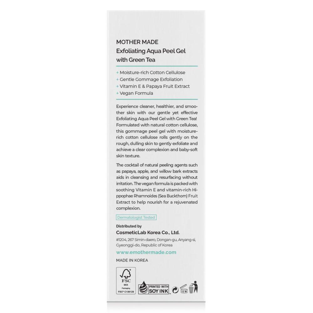 Experience radiant, smooth skin with the Mother Made Exfoliating Aqua Peel Gel with Green Tea. This gentle yet effective exfoliator removes dead skin cells while deeply hydrating and protecting your skin. Perfect for all skin types, this vegan-friendly formula includes natural cellulose, green tea extract, and hyaluronic acid, making it ideal for sensitive or dry skin.