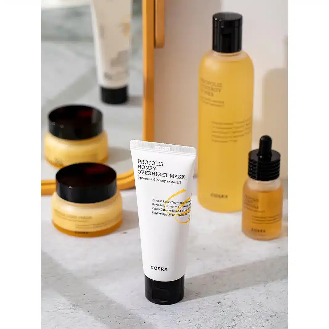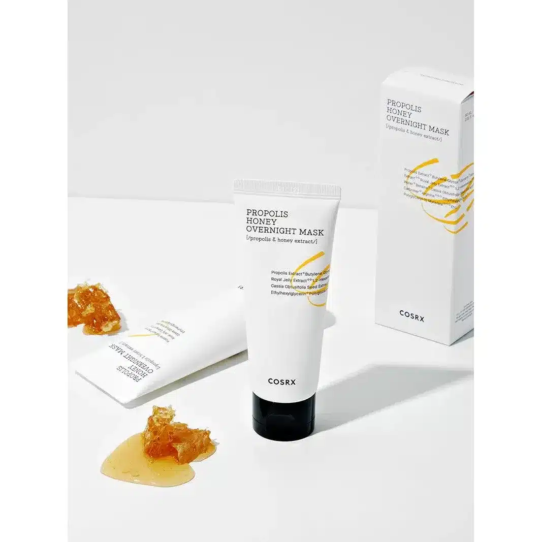 Buy COSRX Full Fit Propolis Honey Overnight Mask for a 3-in-1 skincare solution. This versatile mask, packed with 87% Propolis Extract and beeswax, hydrates, soothes, and revitalizes your skin, leaving it soft and refreshed. Use it as an overnight mask, daily moisturizer, or wash-off mask for glowing, nourished skin.