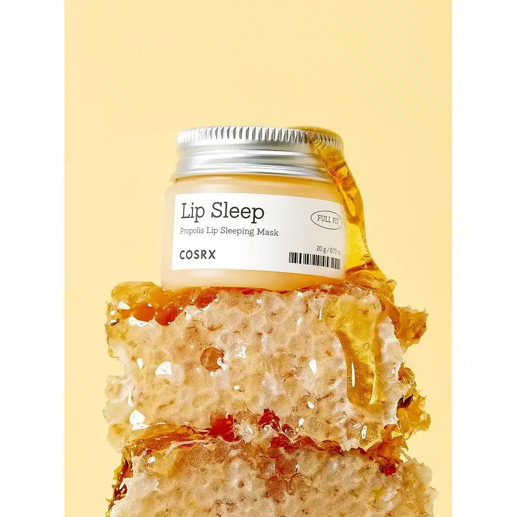 Buy COSRX Full Fit Propolis Lip Sleeping Mask for soft, plump, and hydrated lips. This honey-rich lip mask, with its Honey-6 Complex, shea butter, and sunflower oil, delivers deep nourishment overnight or can be used as a daytime balm for lasting moisture and protection.