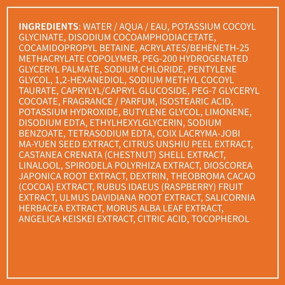 Distilled Water, Potassium Cocoyl Glycinate, Disodium Cocoamphodiacetate, Cocamidopropyl Betaine, Acrylates/Beheneth-25 Methacrylate Copolymer, PEG-200 Hydrogenated Glyceryl Palmate, Sodium Chloride, Pentylene Glycol, 1,2-Hexanediol, Sodium Methyl Cocoyl Taurate, Caprylyl/Capryl Glucoside, PEG-7 Glyceryl Cocoate, Isostearic Acid, Potassium Hydroxide, Fragrance, Butylene Glycol, Limonene, Disodium EDTA, Ethylhexylglycerin, Sodium Benzoate, Tetrasodium EDTA, Coix Lacryma-Jobi Ma-yuen Seed Extract, Citrus Unshiu Peel Extract, Castanea Crenata (Chestnut) Shell Extract, Linalool, Spirodela Polyrhiza Extract, Dioscorea Japonica Root Extract, Dextrin, Theobroma Cacao (Cocoa) Extract, Rubus Idaeus (Raspberry) Fruit Extract, Ulmus Davidiana Root Extract, Salicornia Herbacea Extract, Morus Alba Leaf Extract, Angelica Keiskei Extract, Citric Acid, Tocopherol
