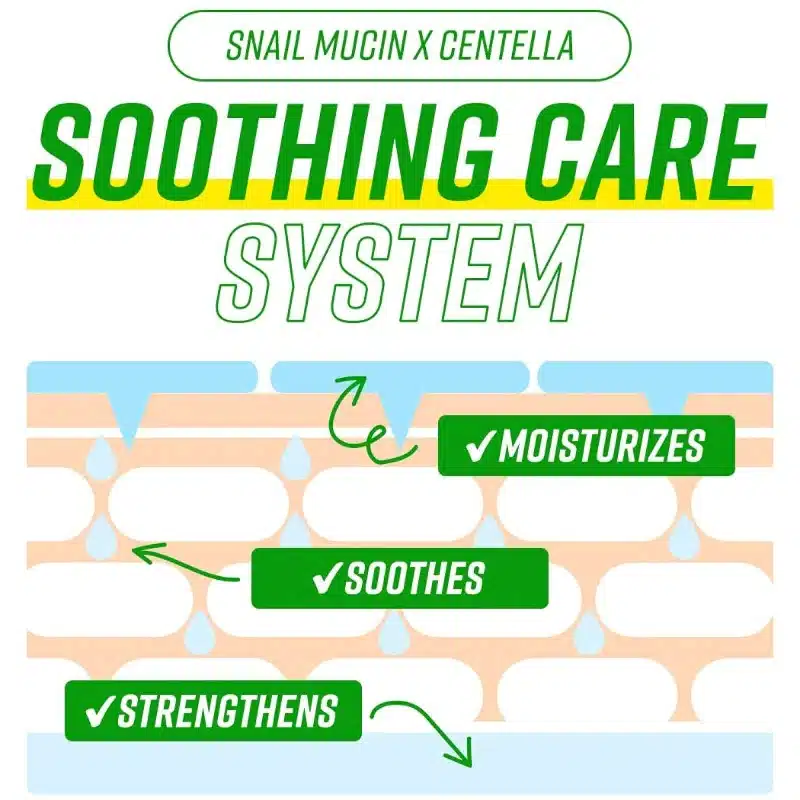 Water, Cetyl Ethylhexanoate, Butylene Glycol, Glycerin, Squalane, Centella Asiatica Extract, Bacillus Ferment, 1-2,Hexanediol, Dicaprylyl Carbonate, Cetearyl Alcohol, Cetearyl Olivate, Dimethicone, Trehalose, Arachidyl Alcohol, Sorbitan Olivate, Arginine, Carbomer, Cyclopentasiloxane, Panthenol, Caprylyl Glycol, Behenyl Alcohol, Hydrogenated Lecithin, Polysilicone-11, Arachidyl Glucoside, Ethylhexylglycerin, Simmondsia Chinensis (Jojoba) Seed Oil, Macadamia Ternifolia Seed Oil, Allantoin, Sodium Hyaluronate, Mentha Haplocalix Extract, Snail Secretion Filtrate, Menthyl Lactate, Disodium EDTA, Backhousia Citriodora Leaf Oil, Phenoxyethanol, Asiaticoside, Madecassic Acid, Asiatic Acid, Beta-Glucan