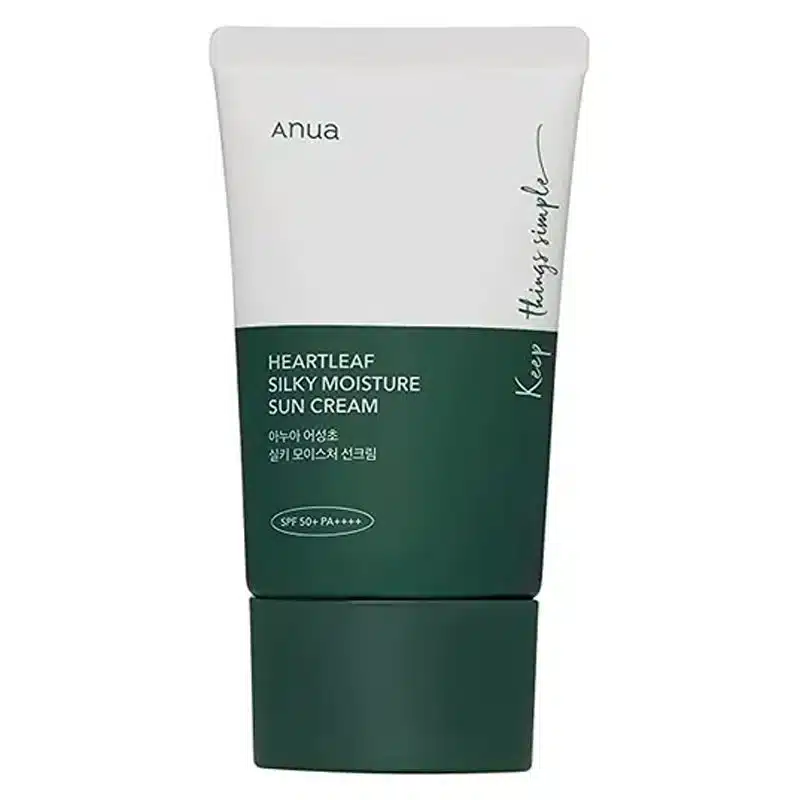 Buy Anua Heartleaf Silky Moisture Sun Cream for lightweight, non-greasy sun protection with SPF50+ PA++++. Enriched with Heartleaf extract, hyaluronic acid, and niacinamide, it hydrates, soothes, and shields your skin from harmful UV rays. Perfect for sensitive, oily, and combination skin, this vegan-friendly sunscreen absorbs quickly, leaving a silky, natural finish for everyday use.