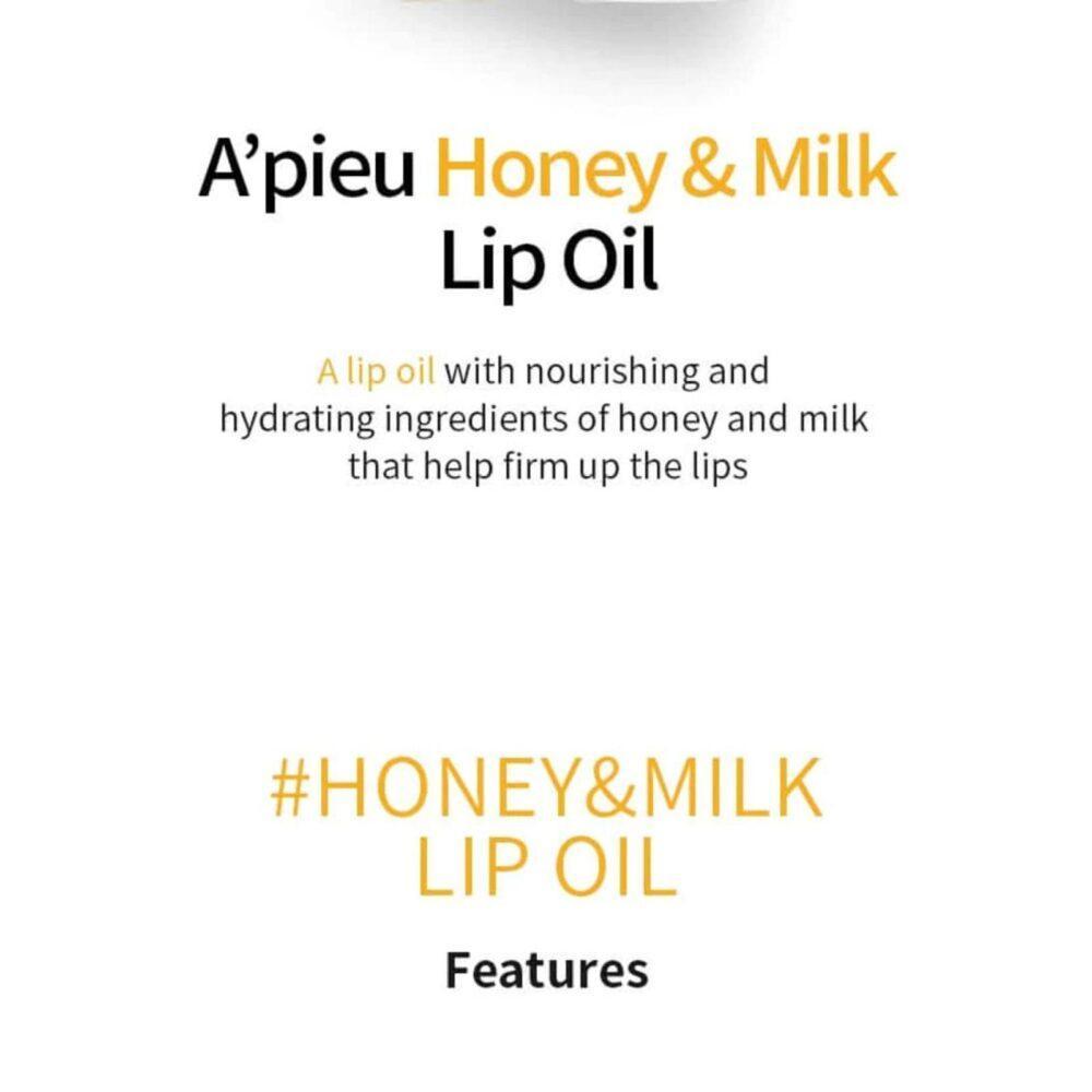 Buy A’PIEU Honey & Milk Lip Oil in Peach for soft, hydrated lips with a hint of peach. This non-sticky lip oil combines honey, milk protein, and peach extract to deeply moisturize, leaving a smooth, glossy finish. Perfect for dry, chapped lips, it adds a subtle shine and a fresh peachy scent.