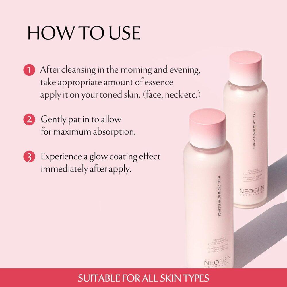 Buy NEOGEN – Hyal Glow Rose Essence to achieve hydrated, glowing skin. This vegan essence blends rose water, hyaluronic acid, and botanical extracts to moisturize, brighten, and soothe for a healthy, dewy complexion.