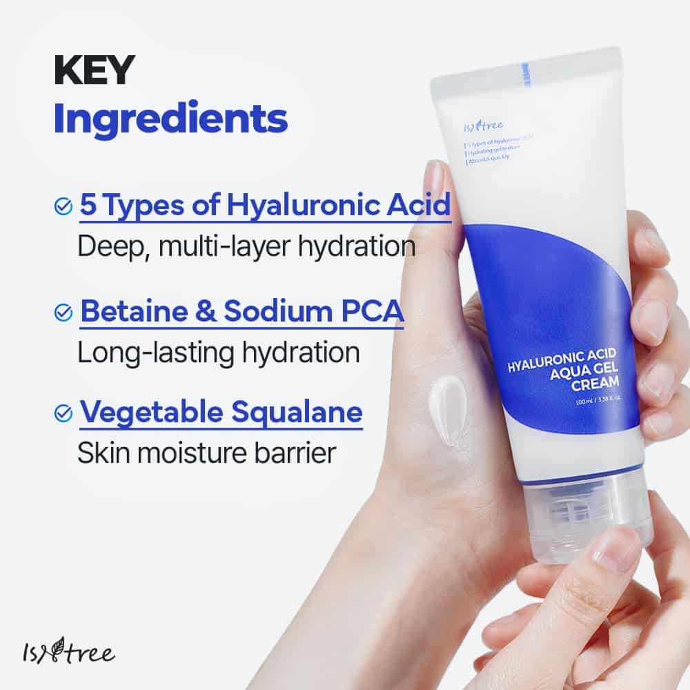 Buy Isntree Hyaluronic Acid Aqua Gel Cream for a vegan, fragrance-free moisturizer! With five hyaluronic acid types, it hydrates oily skin and sensitive skin without greasiness. Lightweight and soothing, it delivers a radiant complexion. Add to cart now.