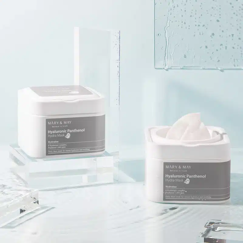Buy Mary & May Hyaluronic Panthenol Hydra Mask for a boost of lasting hydration. With six types of Hyaluronic Acid and 1,000ppm Panthenol, each mask delivers intense moisture and soothing care. The eco-friendly case includes 30 masks and a tweezer for easy daily use. Perfect for dry, sensitive skin.