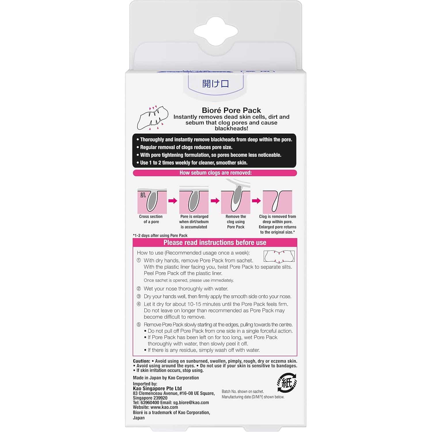 After one use, the Kao – Biore Pore Pack – White visibly reduces blackheads and smooths the nose area. Weekly use (1-2 times) minimizes pore appearance, controls oil, and enhances skin clarity, leaving a refined complexion. Enjoy cleaner, smoother skin with every application.