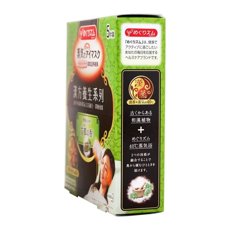 A steam eye mask by Kao that uses self-heating steam and mugwort essence for eye strain relief and relaxation.