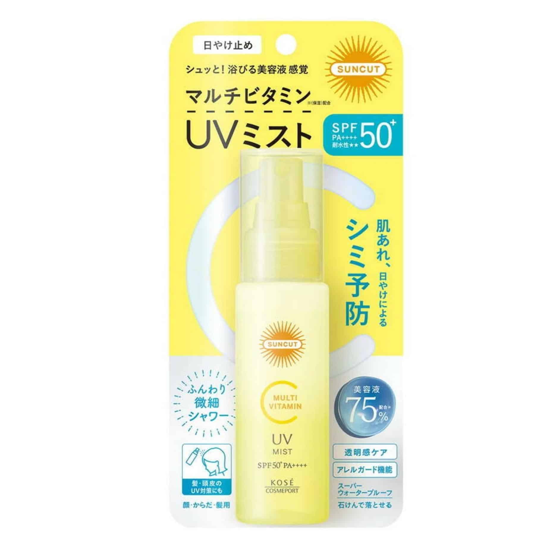 Buy Kose Suncut Multi-Vitamin UV Mist SPF 50+ PA++++ for UV protection and hydration. This cruelty-free sunscreen mist brightens with vitamins, suits sensitive skin, and leaves a non-sticky finish. Add to cart now!