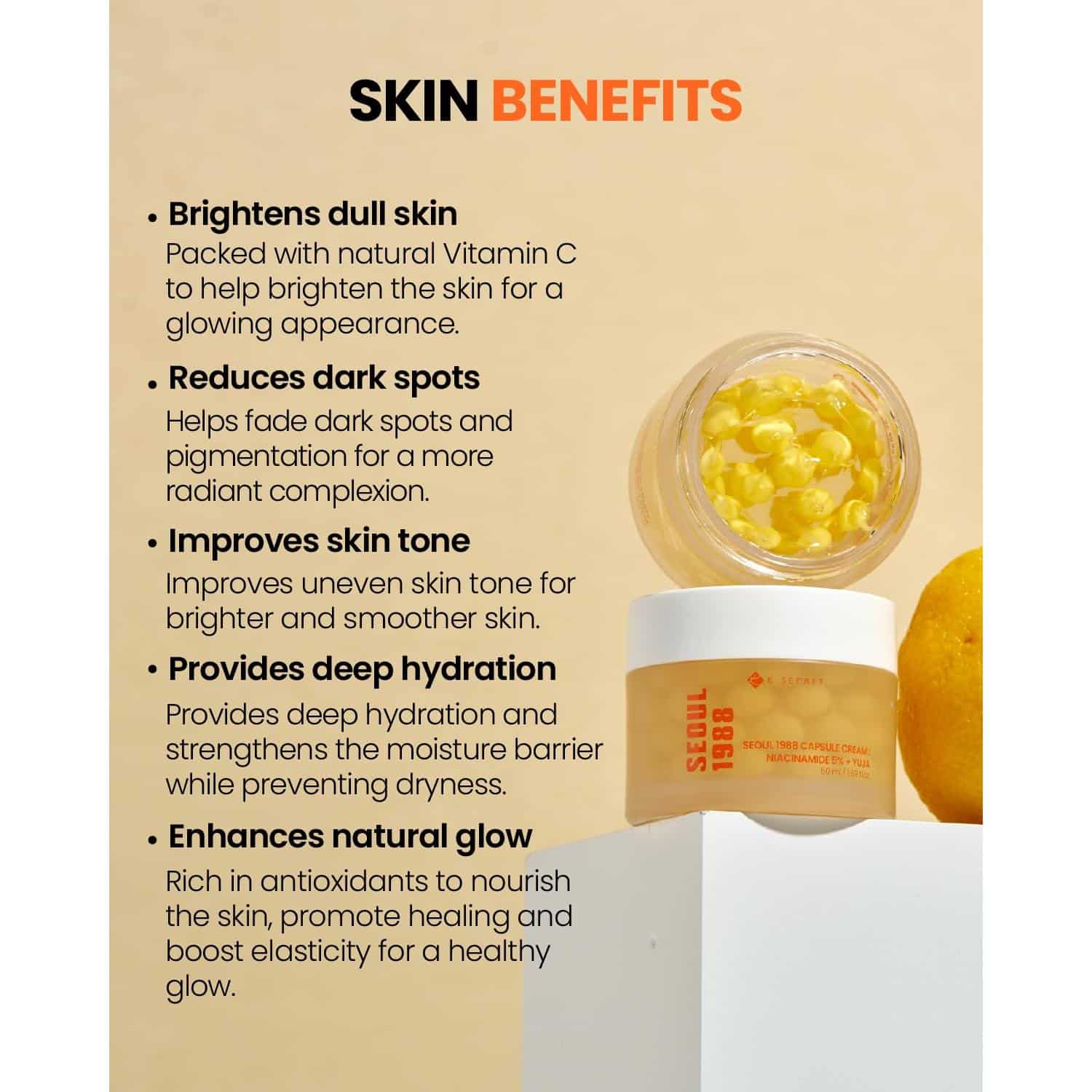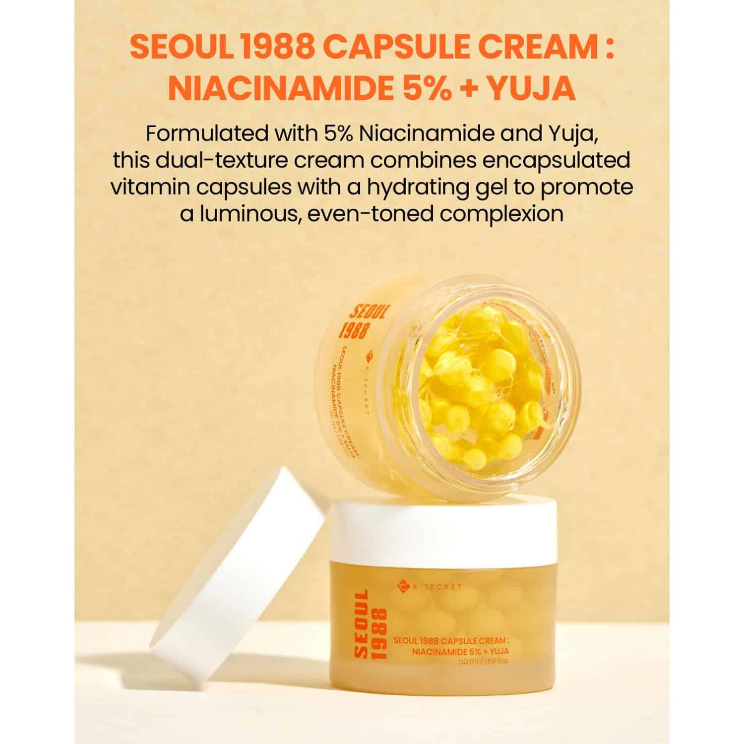 Discover a brighter, more hydrated complexion with KSECRET SEOUL 1988 Capsule Cream Niacinamide 5% + Yuja, your K-beauty essential.