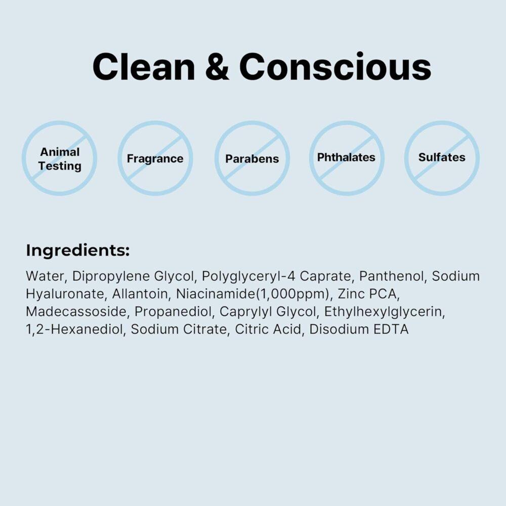 Aqua, Dipropylene Glycol, Polyglyceryl-4 Caprate, Panthenol, Sodium Hyaluronate, Allantoin, Niacinamide(1,000ppm), Zinc PCA, Madecassoside, Propanediol, Caprylyl Glycol, Ethylhexylglycerin, 1,2-Hexanediol, Sodium Citrate, Citric Acid, Disodium EDTA
