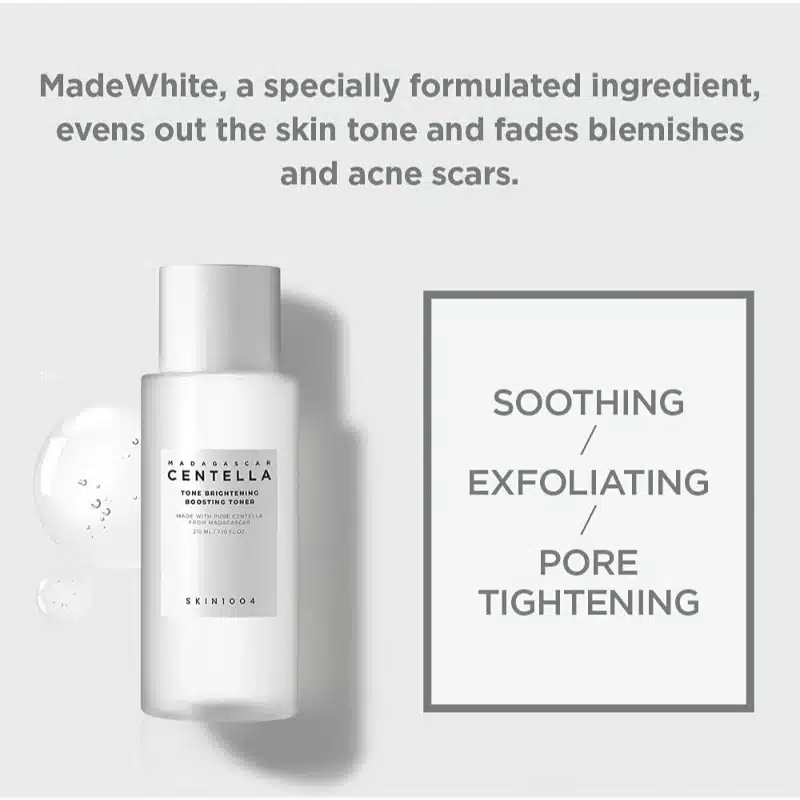 Buy SKIN1004 Madagascar Centella Tone Brightening Boosting Toner for radiant, hydrated skin. This brightening toner combines Centella asiatica extract and Madewhite™ to soothe, hydrate, and brighten your skin. Natural fruit extracts gently exfoliate, while niacinamide targets pigmentation. Suitable for all skin types, this exfoliating toner balances pH and prepares the skin for maximum skincare absorption.