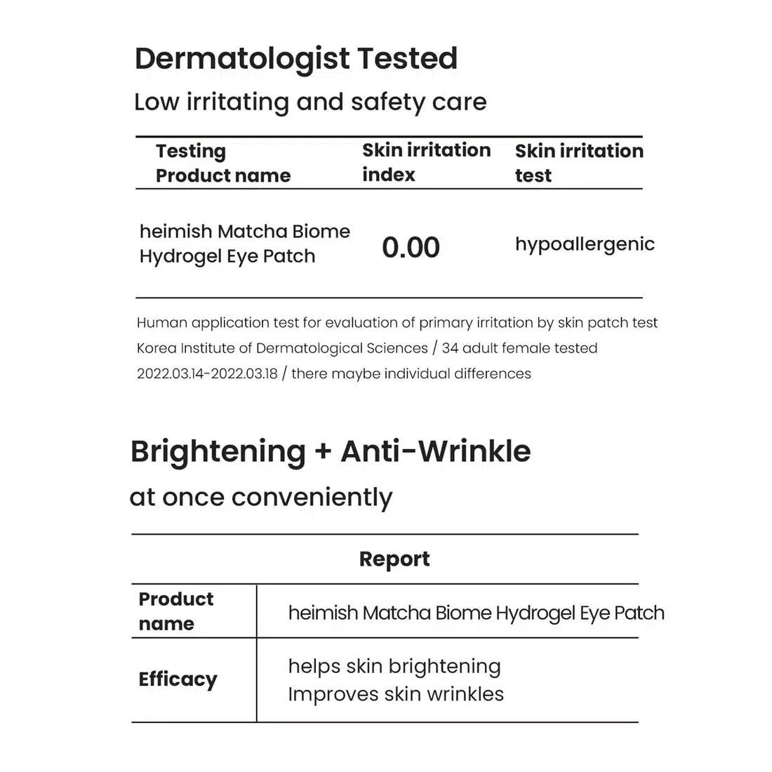 Buy Heimish Matcha Biome Hydrogel Eye Patch for a refreshing, eco-friendly treatment that soothes, brightens, and reduces fine lines. With Matcha probiotics, Niacinamide, and botanical extracts, these patches strengthen the skin barrier and hydrate deeply. Perfect for puffy, tired eyes, with a cooling, highly adhesive hydrogel for all skin types.
