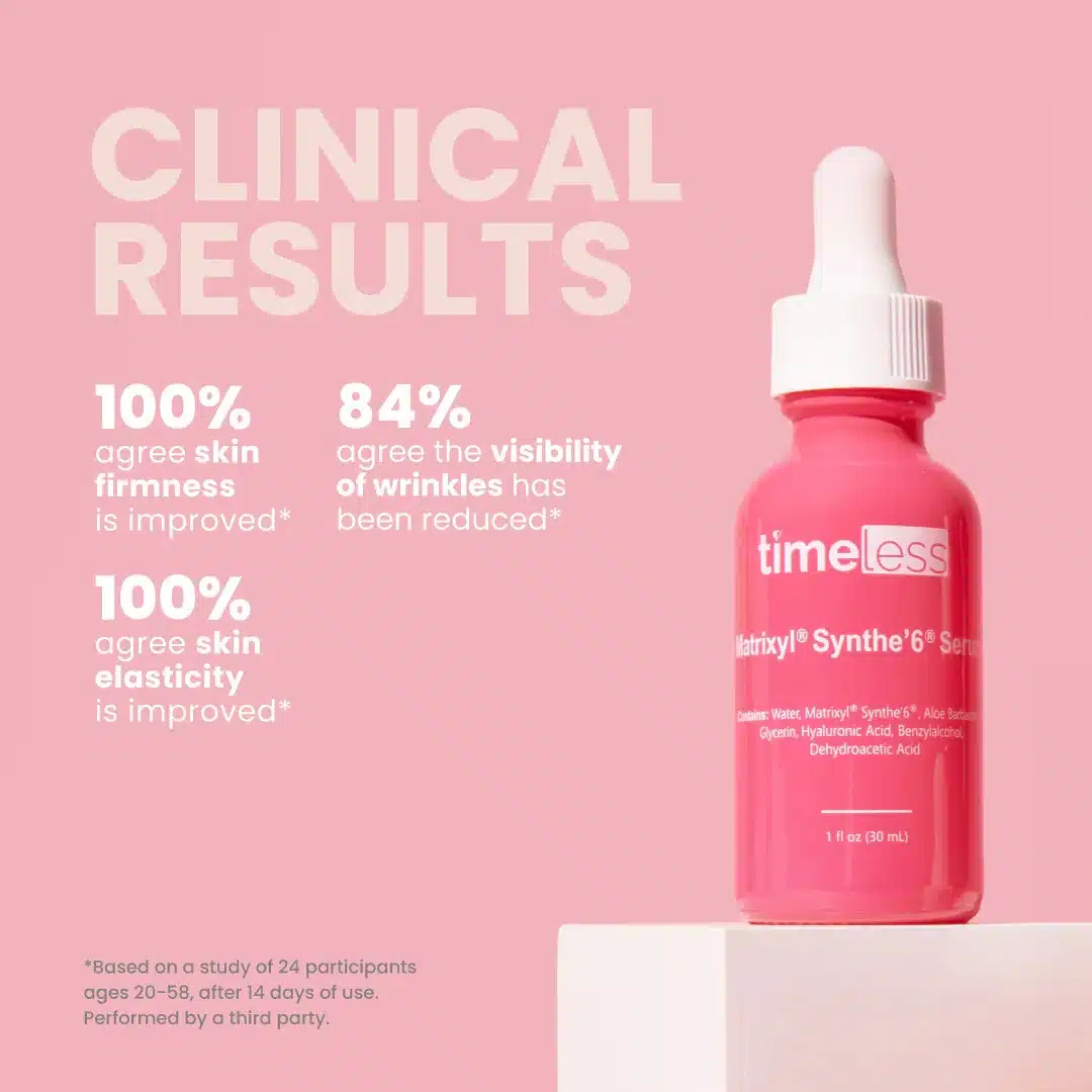 Buy Timeless Matrixyl Synthe’6 Serum for a potent anti-aging solution. This lightweight serum uses Matrixyl Synthe’6 and Hyaluronic Acid to reduce wrinkles, hydrate deeply, and improve skin elasticity. Ideal for all skin types, it revitalizes and firms, leaving your skin smooth and youthful.