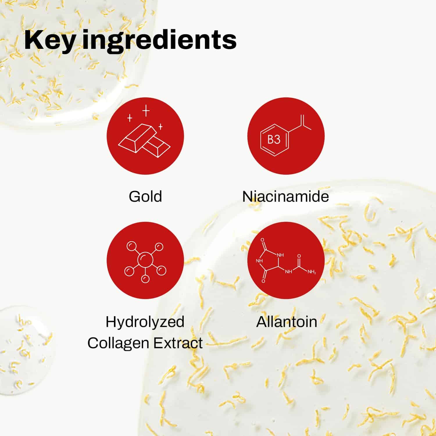 Hydrolyzed Collagen Extract (80%), Polyvinyl Alcohol, Purified Water, Glycerin, Niacinamide, PVP, 1,2-Hexanediol, Sodium Hyaluronate, Vincetoxicum Atratum Extract, Butylene Glycol, Allantoin, Caprylyl Glycol, Polyglyceryl-10 Laurate, Propanediol, Acrylate/C10-30 Alkyl Acrylate Crosspolymer, Tromethamine, Xanthan Gum, Ethylhexylglycerin, Titanium Dioxide (CI 77891), Mica, Agar, Calcium Alginate, Gellan Gum, Red Iron Oxide, Disodium EDTA, Gold (200ppb), Fragrance