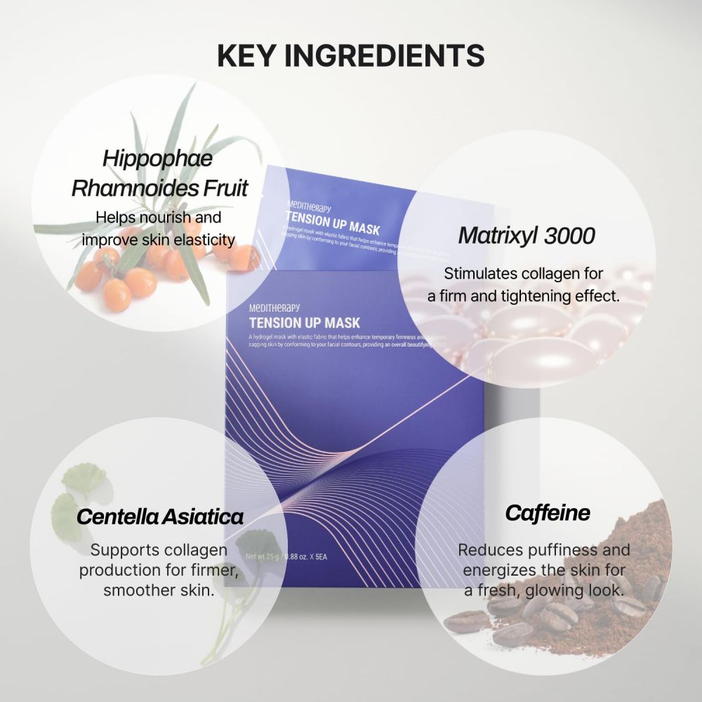 Buy Meditherapy Tension Up Mask for a defined, youthful look! This Korean collagen face mask lifts sagging skin, reduces puffiness, and enhances skin elasticity with hydrogel technology. Vegan, cruelty-free, and perfect for sensitive skin, it delivers a radiant complexion. Shop now for a sculpted jawline!