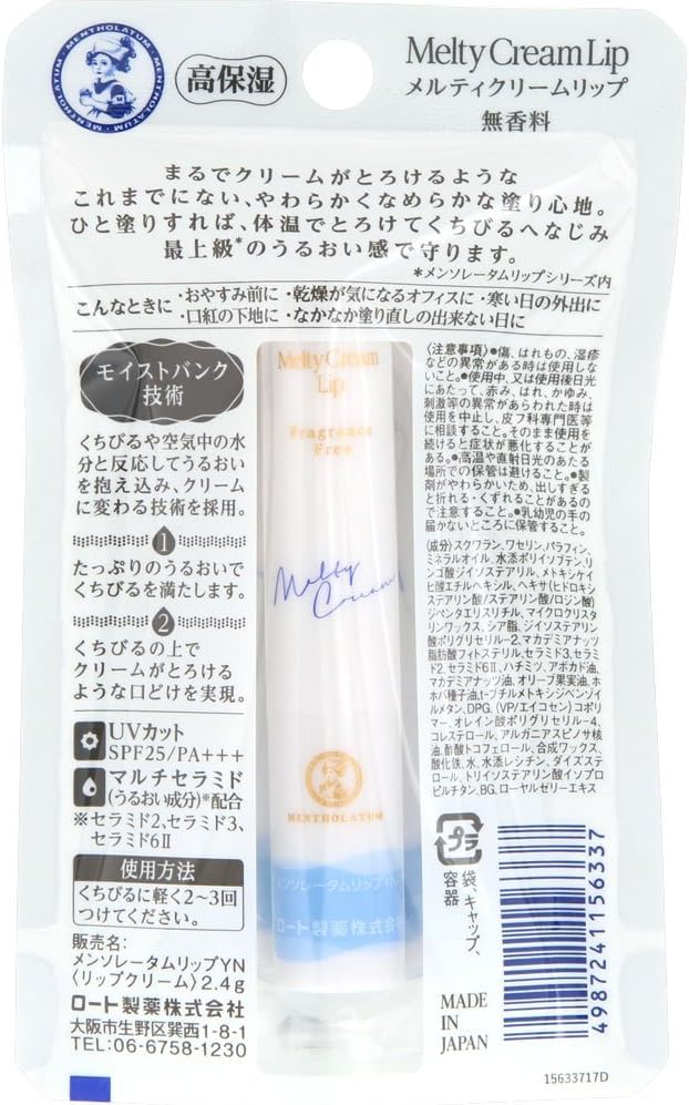 Buy Rohto Mentholatum – Melty Cream Lip Balm SPF 25 PA+++ – Fragrance Free for deeply hydrating, sun-protective lip care. This ultra-soft, non-greasy balm melts on contact to form a moisture-locking layer with squalane, ceramides, and honey extract, keeping lips smooth and nourished. Ideal for sensitive skin. Buy Now and Add to Cart for beautifully protected, soft lips!