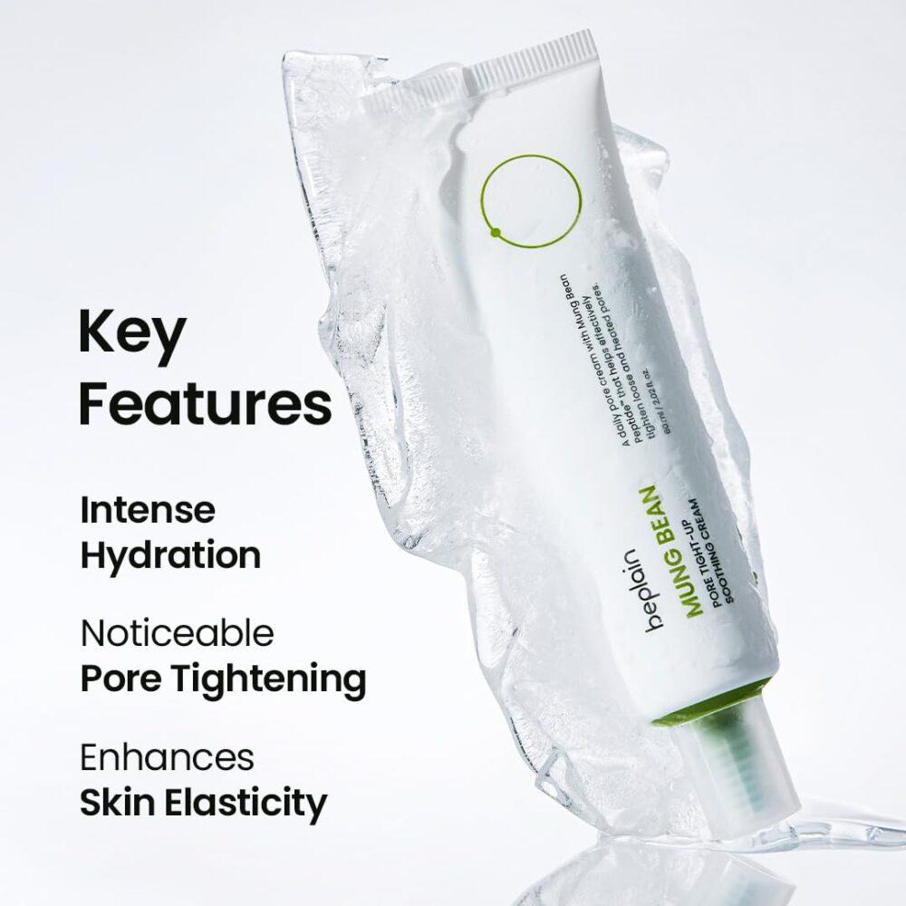 Buy Beplain Mung Bean Pore Tight-up Soothing Cream for lightweight hydration and effective pore tightening. Infused with Mung Bean Peptide™, POMEG-PORE™, niacinamide, and hyaluronic acid, this cooling, non-greasy moisturizer balances oil, soothes irritation, and refines pores. Perfect for oily, combination, and sensitive skin. Buy Now – Add to Cart!