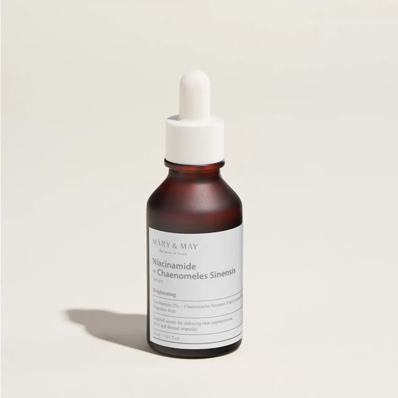 Buy Mary & May Niacinamide + Chaenomeles Sinensis Serum to reveal brighter, balanced skin. With 2% Niacinamide for even tone and 93% Chaenomeles Sinensis for antioxidant power, this lightweight serum controls oil, smooths texture, and enhances radiance. EWG green-grade, cruelty-free, and perfect for all skin types.