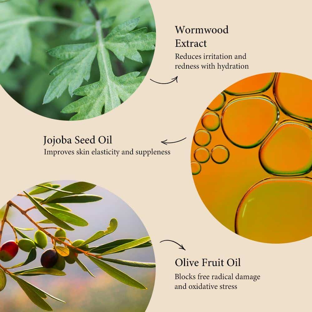 - Wormwood Extract: Provides a soothing and detoxifying effect, calming irritation and purifying the skin.