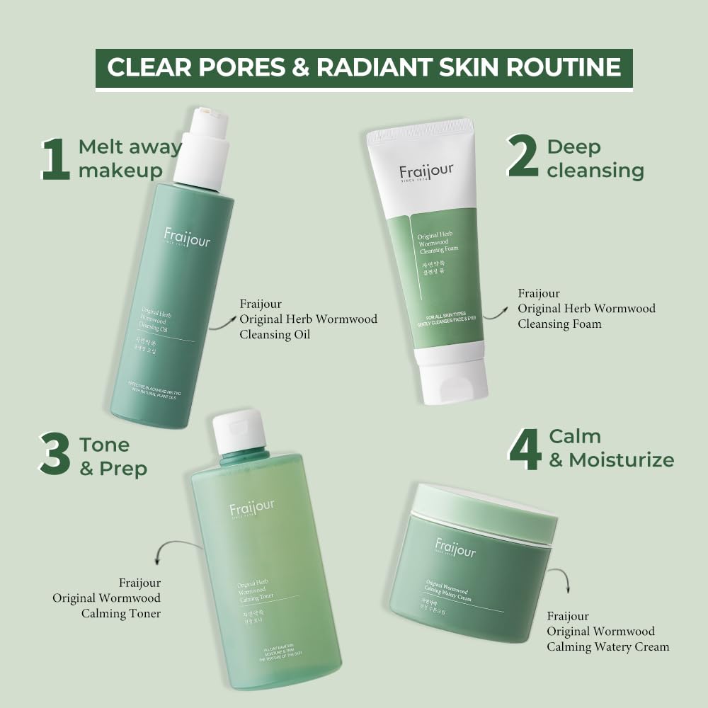 Buy Fraijour Original Herb Wormwood Cleansing Oil for a gentle, herbal-inspired cleanse. Powered by Wormwood extract, jojoba oil, and antioxidants, this vegan-friendly cleansing oil effectively removes makeup and impurities while nourishing and soothing your skin. Ideal for all skin types, it leaves your skin refreshed, balanced, and radiant without any greasy residue.
