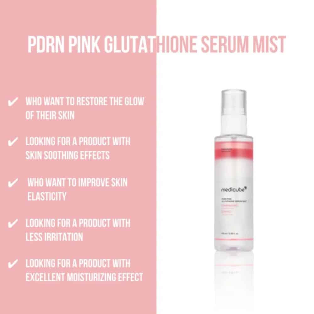 Buy Medicube PDRN Pink Glutathione Serum Mist to rejuvenate your skin with deep hydration and a radiant glow. Infused with Salmon PDRN, Glutathione, and Niacinamide, this lightweight, fast-absorbing mist enhances elasticity, evens skin tone, and reduces fine lines. Suitable for all skin types. Buy Now and add to cart for revitalized, luminous skin!